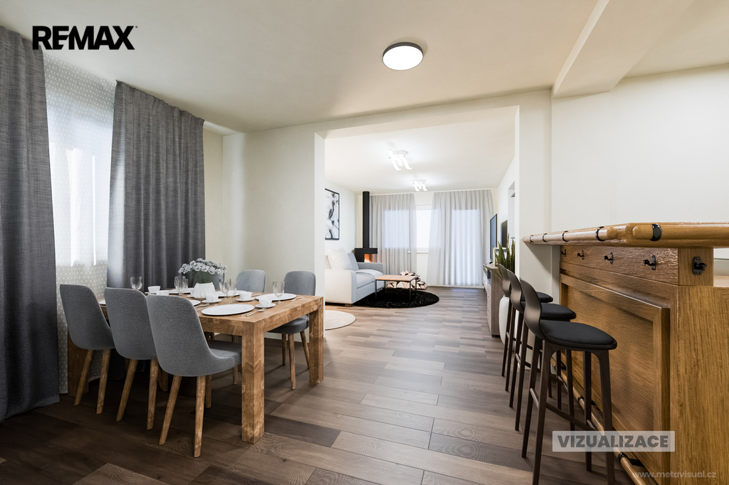Prostory prvního nadzemního podlaží je možné uzpůsobit na trvalý pobyt a využít tak rozsáhlé prostory bývalé hospody.