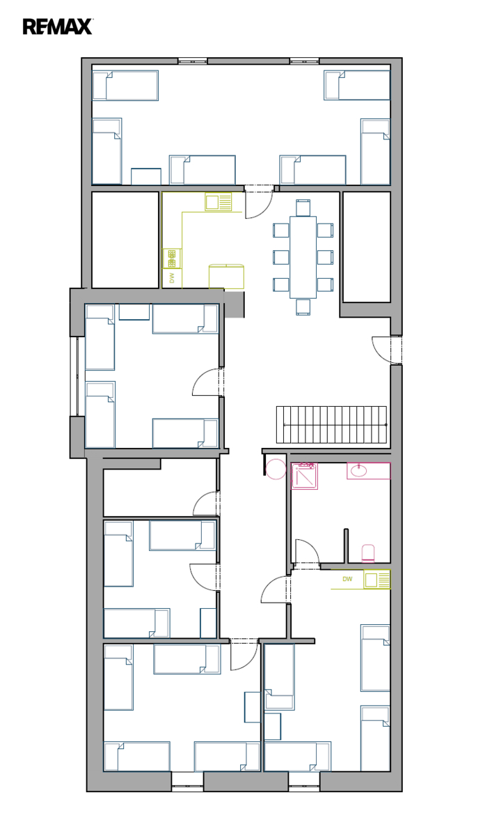 Dispozičně dům rozděluje pět pokojů, kuchyň a celé sociální zázemí v přízemí, zatímco horní patro nabízí dalších pět pokojů, kuchyň, čtyři sprchy a čtyři WC; celkově jsou k dispozici tři plně vybavené kuchyně, devět sprchových koutů a deset toalet, takže provoz zůstává plynulý i při plné obsazenosti.