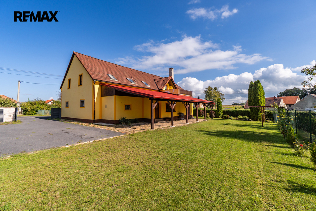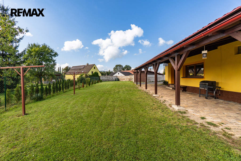 Rozlehlá oplocená zahrada nabízí příjemné posezení na terase, prostor pro grilování, bezpečné parkování několika vozů a potenciál vybudovat altán, wellness zónu či dětské hřiště; navíc je k dispozici sklep a samostatná bouda na kola či nářadí.