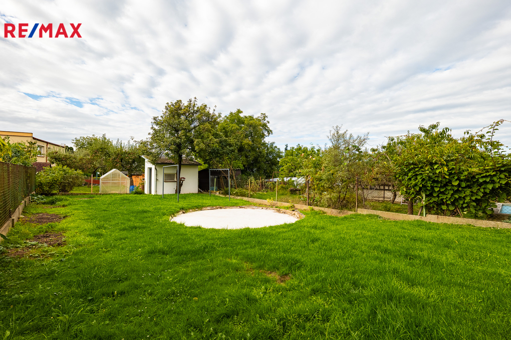 Zahrada je převážně zatravněná a v zadní části zahrady je malý domek na nářadí.