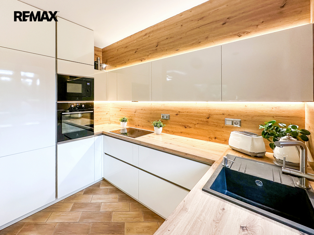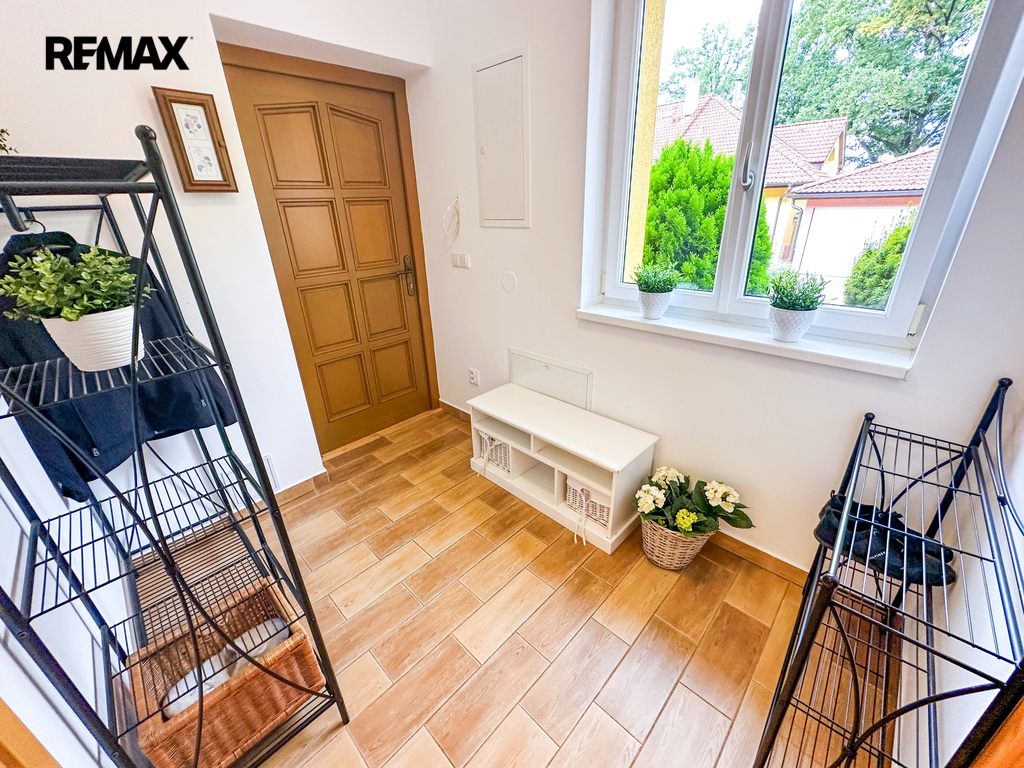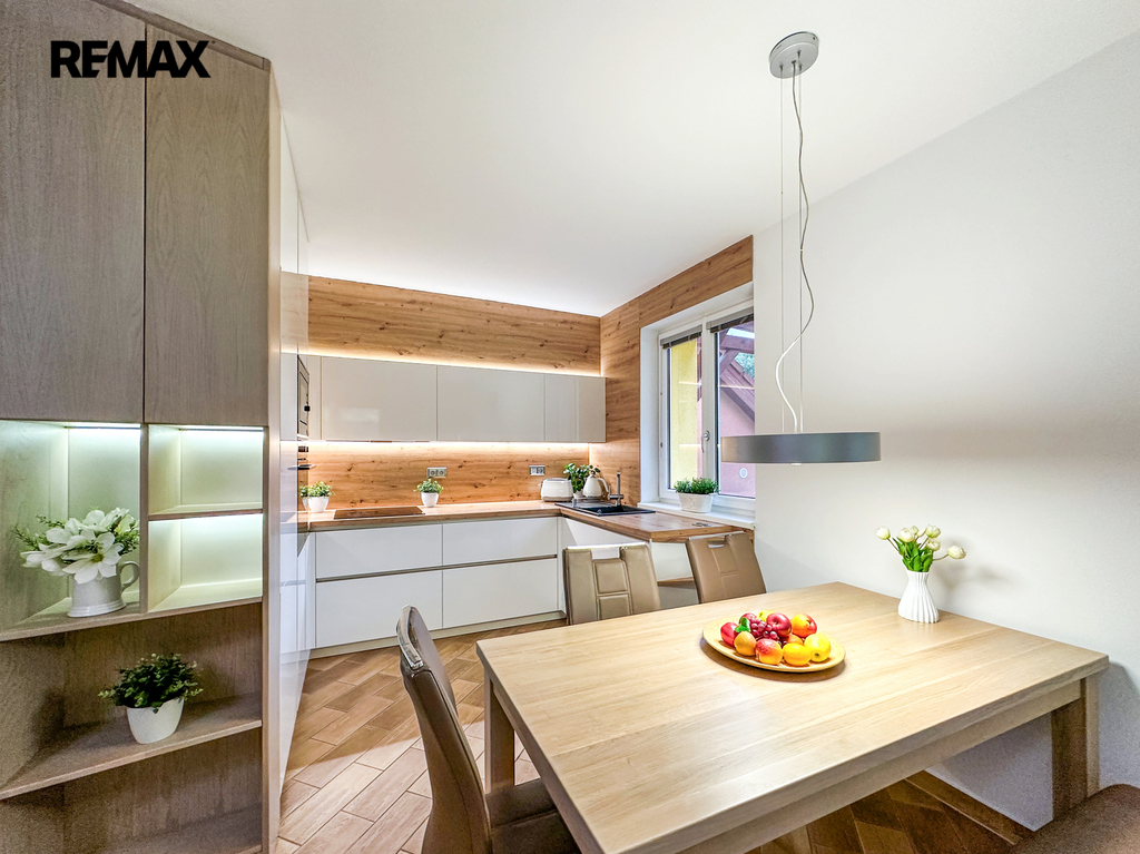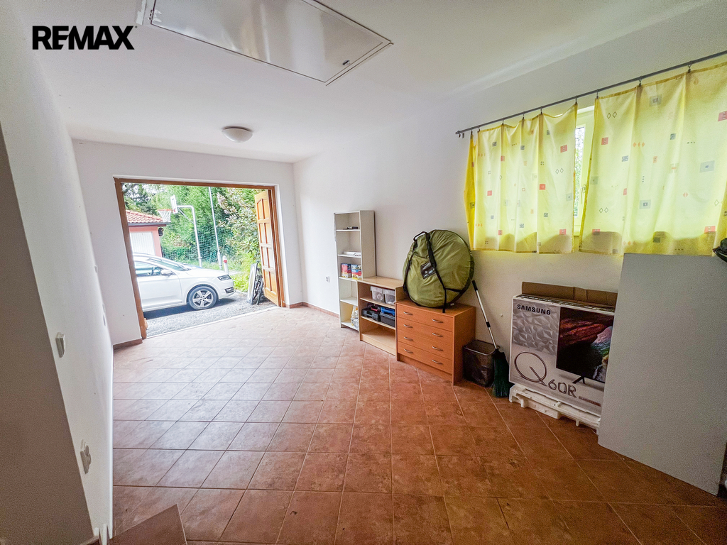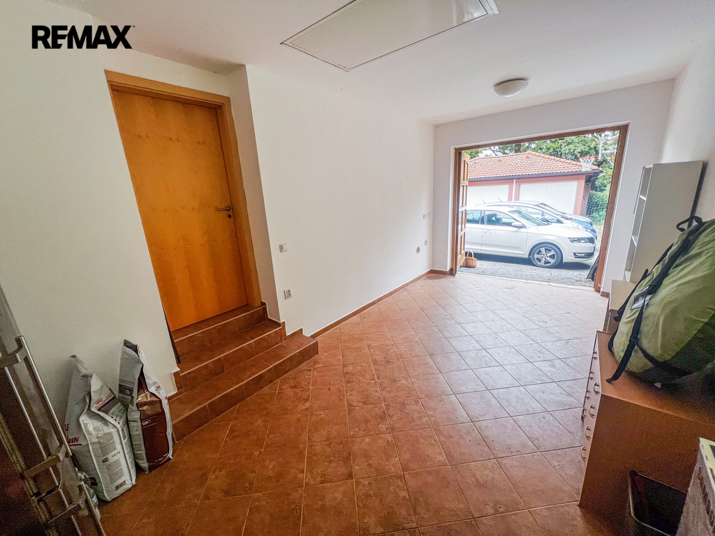 Přízemí: Centrum domova tvoří prostorný obývací pokoj s kuchyňským koutem. Kuchyňská linka byla kompletně zrekonstruována v roce 2015 a nabízí dostatek pracovního prostoru i pro velký rodinný oběd. Dále zde najdete zádveří, technickou místnost, spíž, koupelnu s WC a přímý vstup do garáže (18 m²).