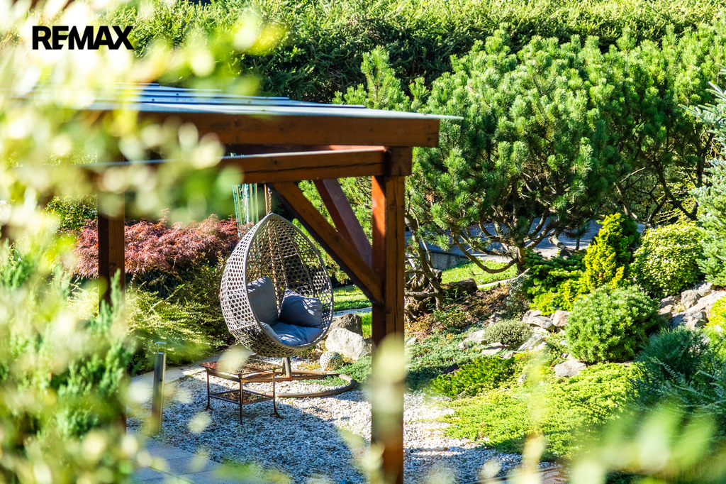 K domu náleží krásná udržovaná 753m2 velká zahrada, která poskytuje příjemné soukromí pro rodinné posezení. K dispozici je krytá terasa pro odpočinek za každého počasí a praktický zahradní domek.