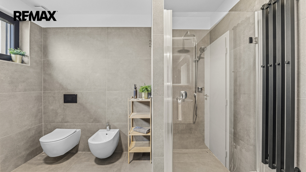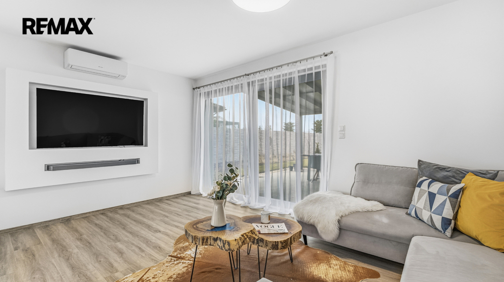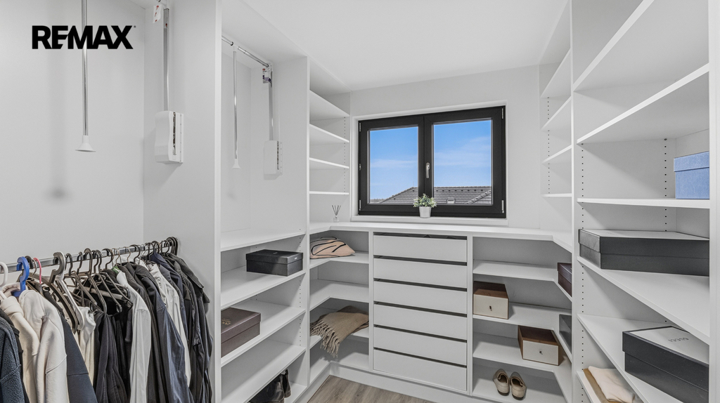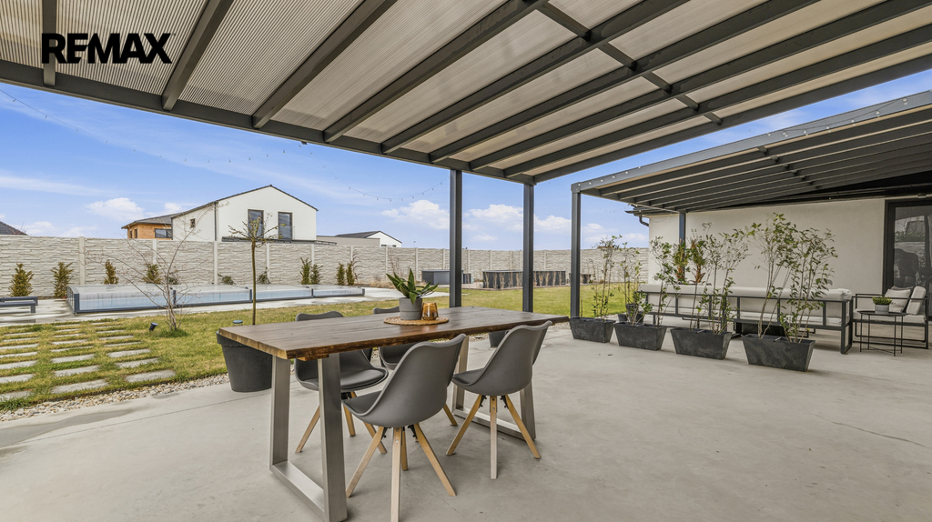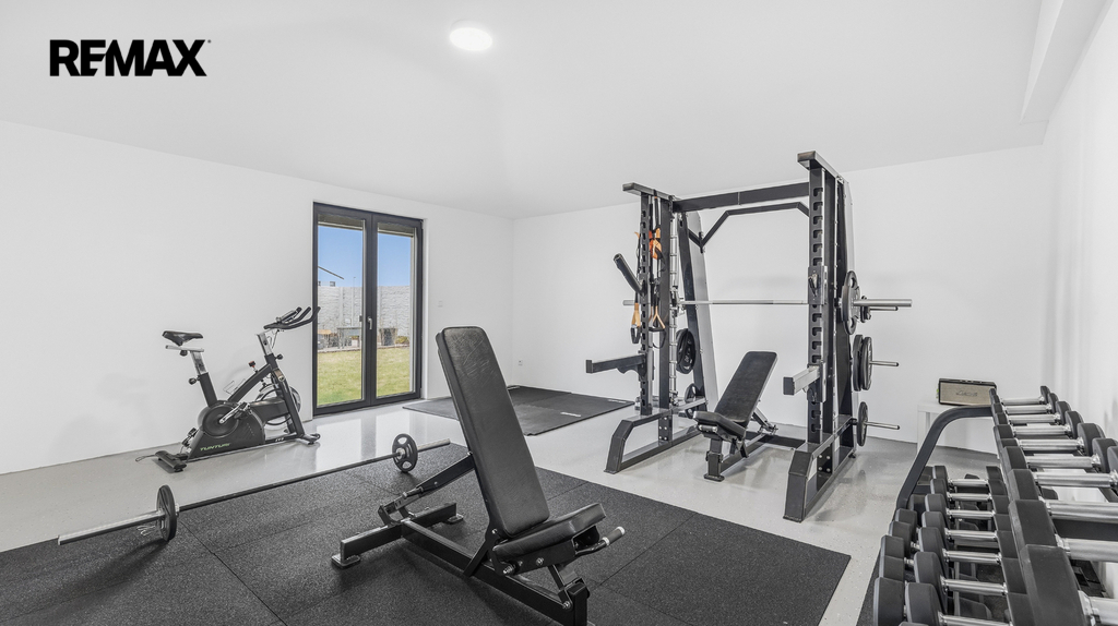 Dominantou přízemí je nádherně prosvětlený obývací prostor s kuchyní a jídelnou, který díky velkoformátovým oknům a HS portálu plynule navazuje na prostornou terasu o výměře 76 m², ideální pro relaxaci i společenské chvíle. Součástí kuchyňské linky jsou kvalitní spotřebiče AEG a jídelna je vybavena designovým dřevěným stolem z masivu na míru. V přízemí se dále nachází vstupní hala s vestavnými skříněmi, dvojgaráž o velikosti 43 m² s přímým vstupem do domu, fitness místnost, hostinský pokoj se vstupem na terasu, technická místnost, dvě spíže a koupelna se sprchovým koutem.