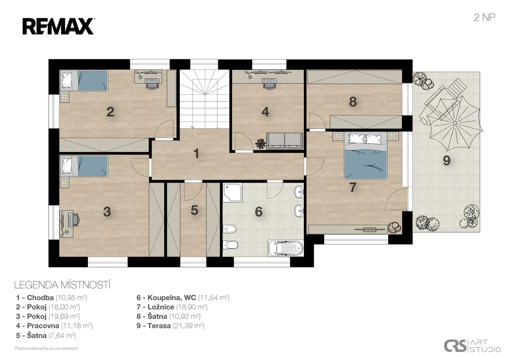 V patře je klidová zóna domu s hlavní ložnicí, vlastní šatnou a vstupem na soukromou terasu o velikosti 21 m2 s výhledem na Prahu, dvěma dětskými pokoji, pracovnou, prostornou koupelnou s vanou i sprchovým koutem a další samostatnou šatnou. Prosklené schodiště propojující obě podlaží dodává interiéru vzdušnost a dostatek denního světla.