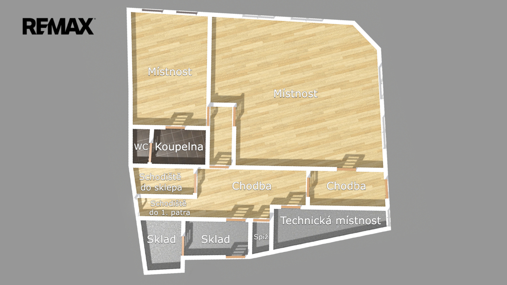 Dispozici přízemí tvoří vstupní chodba, prostorná hlavní místnost, menší pokoj, koupelna s WC, technická místnost, chodba a sklad. Za domem je menší dvorek. Přízemí je aktuálně v rekonstrukci, což umožňuje dokončení podle vlastních představ.