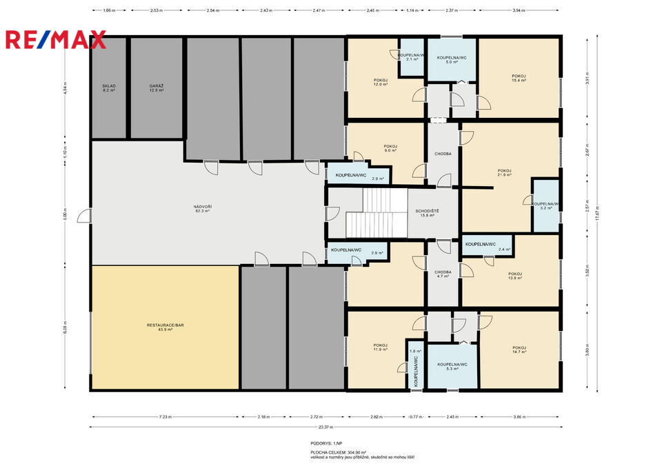 V přízemí se nachází kryté venkovní posezení ( venkovní kuchyně), 8 samostatných pokojů, 5 uzamykatelných boxů na kola (včetně možnosti nabíjení elektrokol, vše pod dohledem kamer v uzamčeném dvoře penzionu), dvůr o výměře 62 m2, celková UP přízemní části je 305 m2.