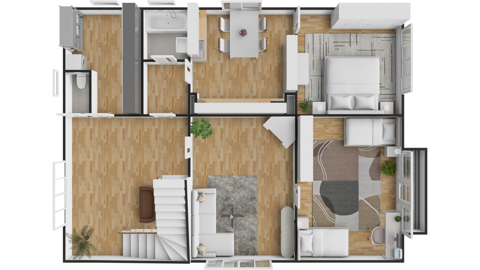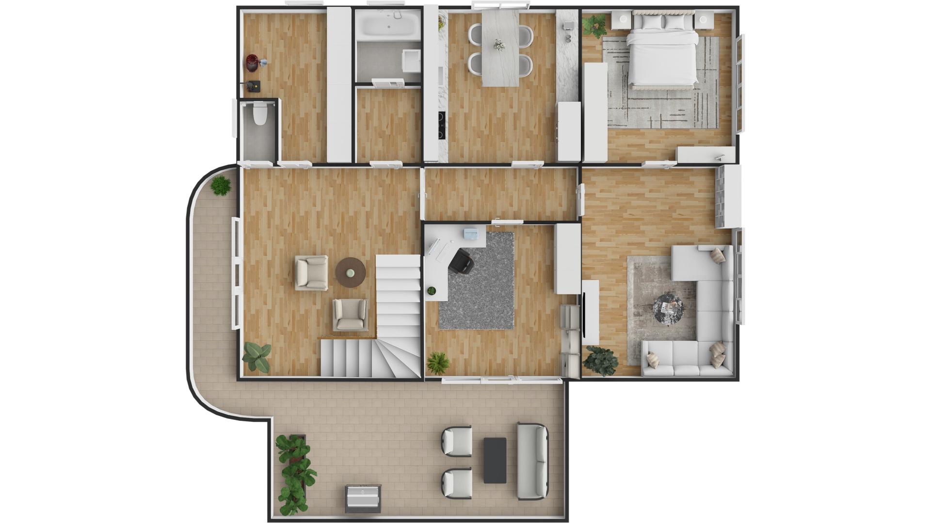 1. NP: vstupní hala, letní kuchyně, technická místnost, dílna, úložná spíž velká, sklep, garáž pro jedno vozidlo a kousek od domu druhá garáž pro jedno vozidlo