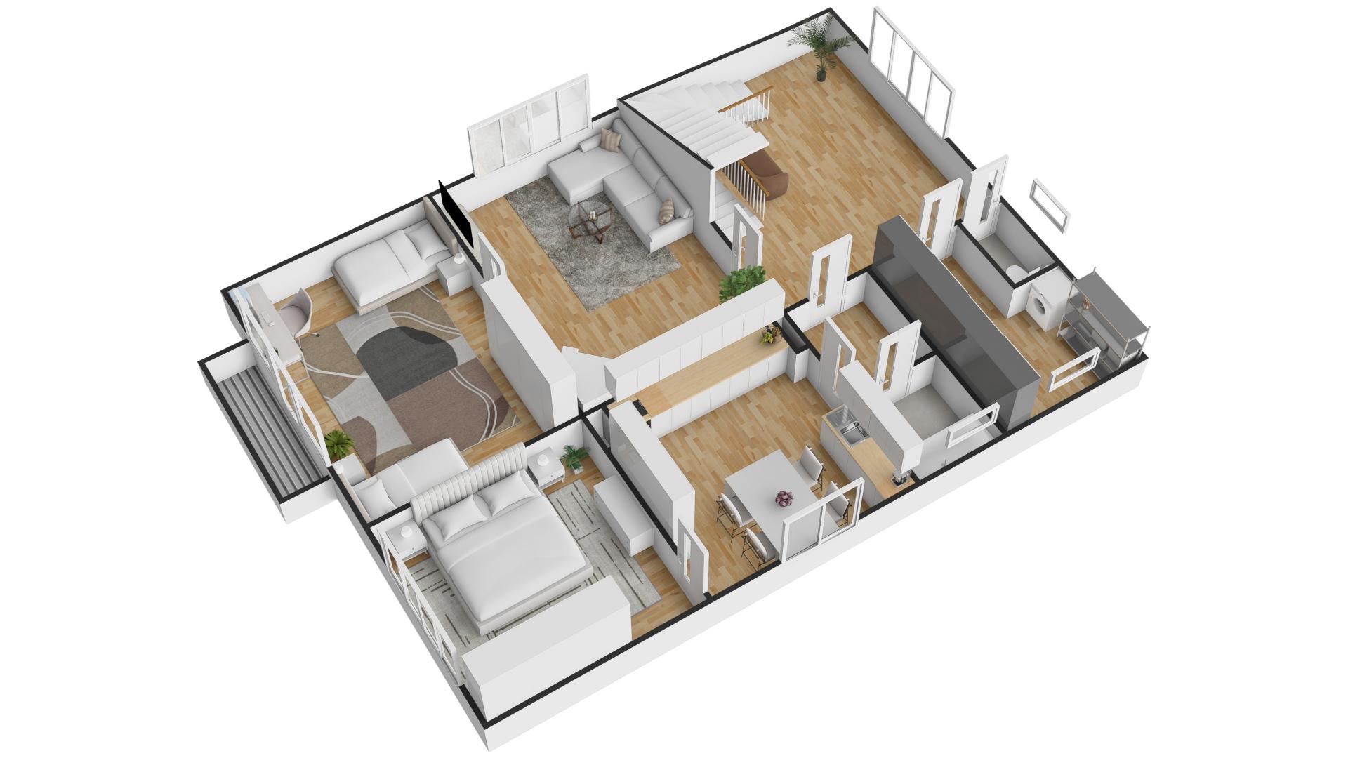 2. NP: byt 3+1: hala, WC , koupelna, spíž, kuchyně, pokoj, obývací pokoj, ložnice, terasa spojená s balkonem