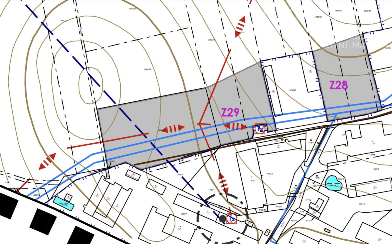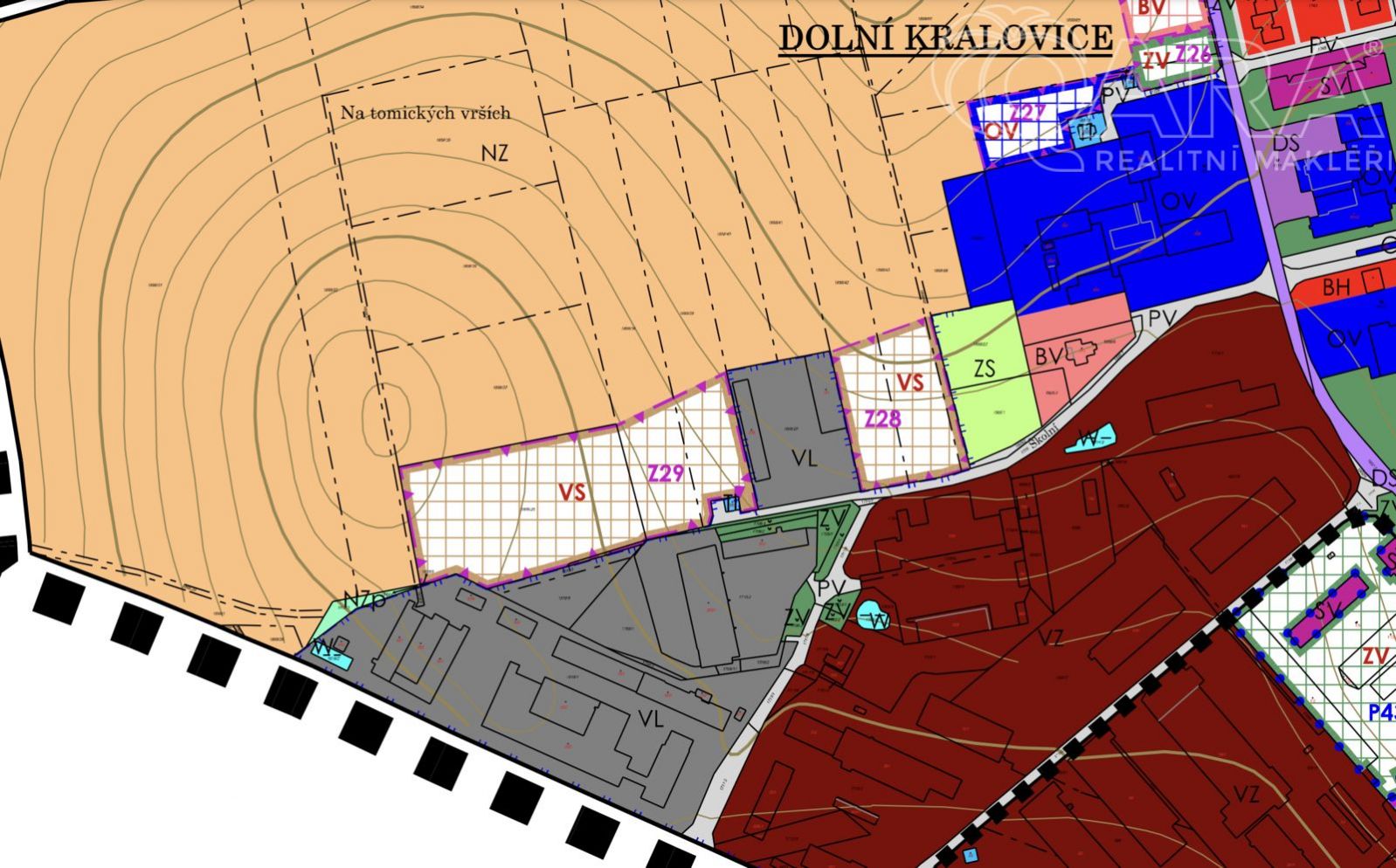 Celá plocha je v zastavitelném území. Dle územního plánu se jedná o plochy smíšené výrobní - výrobny a provozovny živnostenského charakteru (označení VS - Z29). Maximální celková zastavěná plocha je 1500 m2. Možno postavit např. výrobní či skladovací halu. Max. výška stavby/budovy 15 m (1+P). Pozemek lze do budoucna rozdělit až na 4 parcely (minimální velikost každého nově vzniklého pozemku bude 2500 m2). Nyní však prodáváme jako celek.