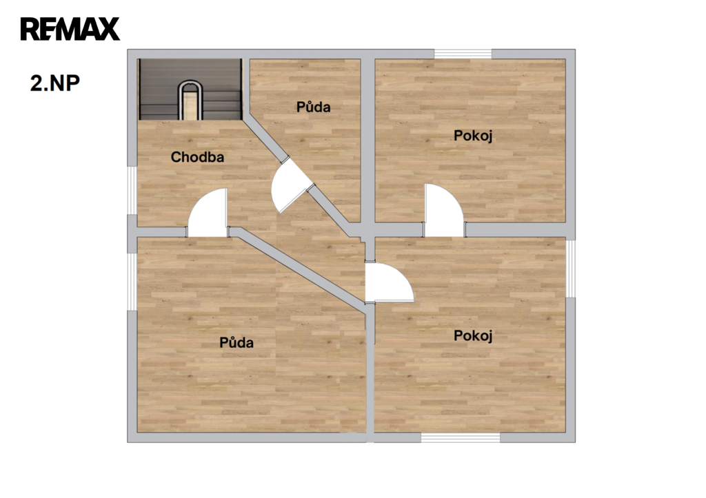 Ve 2.NP se nachází dva pokoje a půda s možností předělání na další obytnou místnost. Podlahová plocha 73 m².