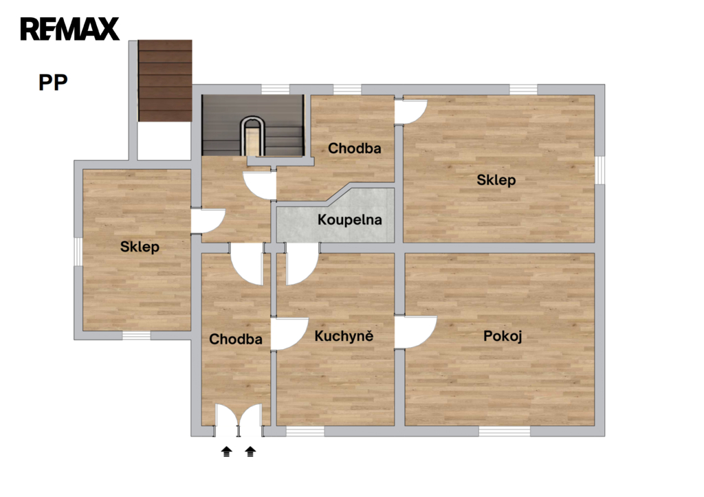 Do PP se dostaneme jak vnitřním schodištěm tak i vstupem přímo ze zahrady. Nyní je zde výminek - dva pokoje s koupelnou i toaletou. Chodba a další místnosti. Tyto prostory lze využít jako ateliér, pracovnu, hobby místnost a pod…