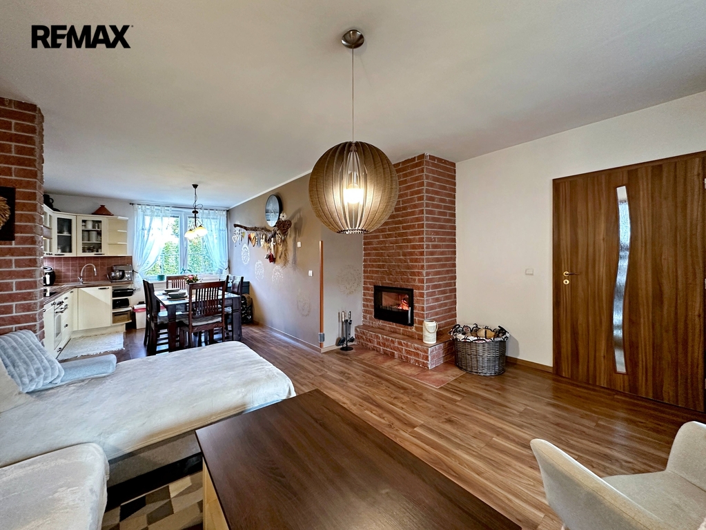 Dispozice domu je prakticky řešena. Vstup tvoří veranda s velkými okny orientovanými do zahrady, na kterou navazuje předsíň. Obytný prostor je tvořen útulným obývacím pokojem s krbem, ten slouží jako druhý zdroj vytápění a je napojen na rozvody do radiátorů a umožňuje vytápění celého domu. Obývací pokoj je propojen s prostornou kuchyní s jídelním koutem. Dále jsou k dispozici světlá ložnice, prostorný dětský pokoj, koupelna a samostatné WC.