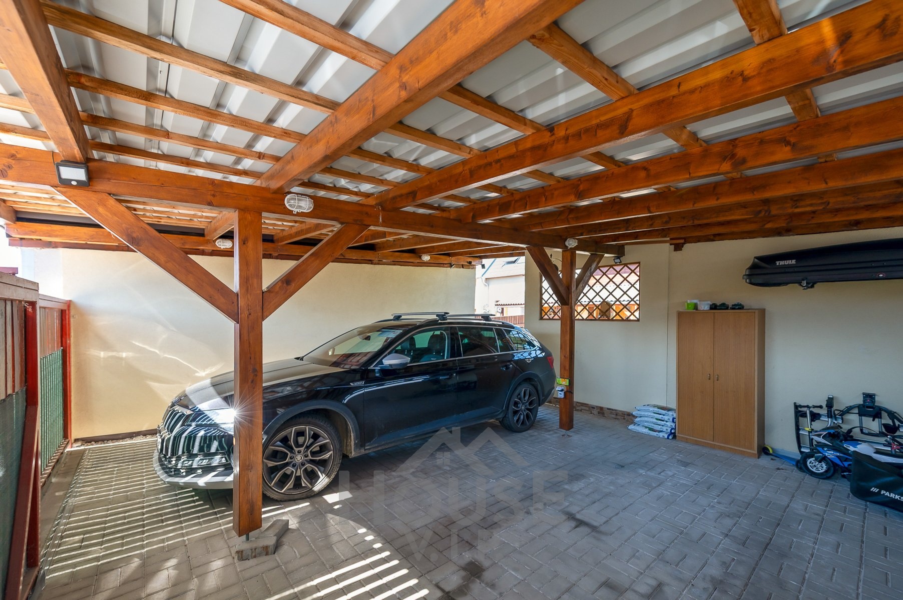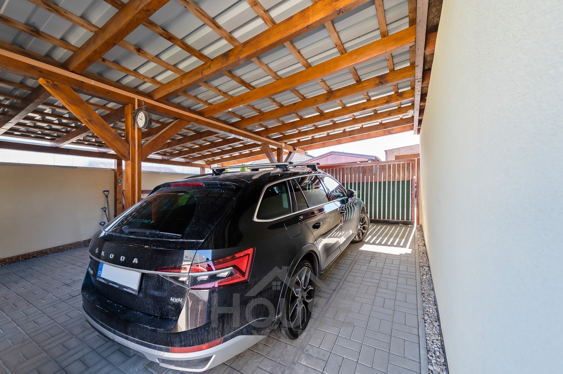 K domu náleží garáž pro dvě auta, zahradní domek a příjemná zahrada, která poskytuje dostatek soukromí i prostoru pro odpočinek či volnočasové aktivity.