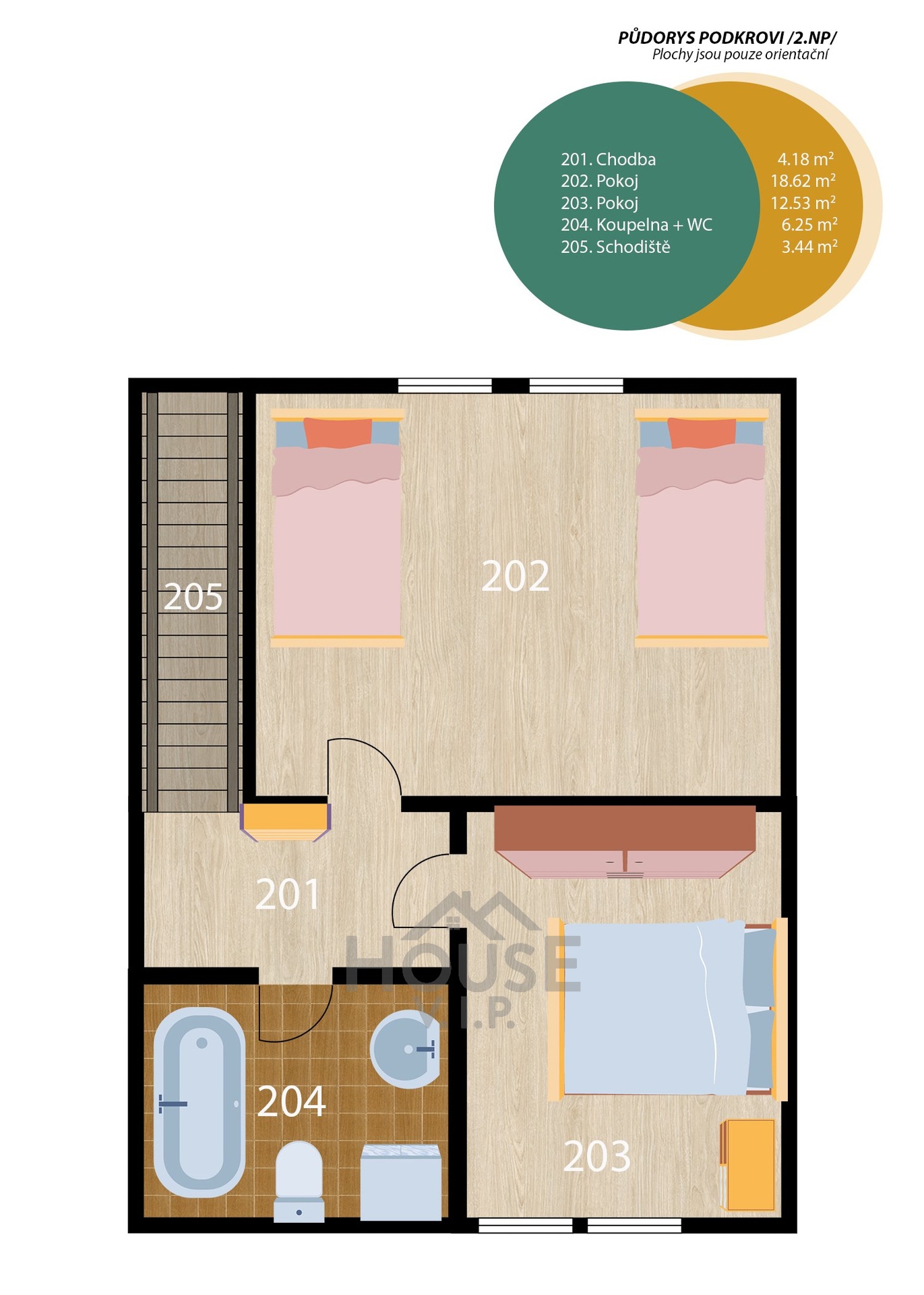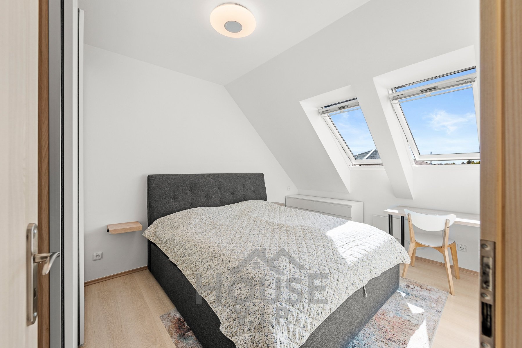 V patře jsou pokoje vybaveny radiátory, přičemž koupelna disponuje kombinací podlahového vytápění pro vyšší komfort. Velkou výhodou nemovitosti je možnost dalšího rozšíření – na půdě lze vybudovat další obytný pokoj a obdobný potenciál nabízí i zimní zahrada, ze které lze vytvořit plnohodnotný pokoj.