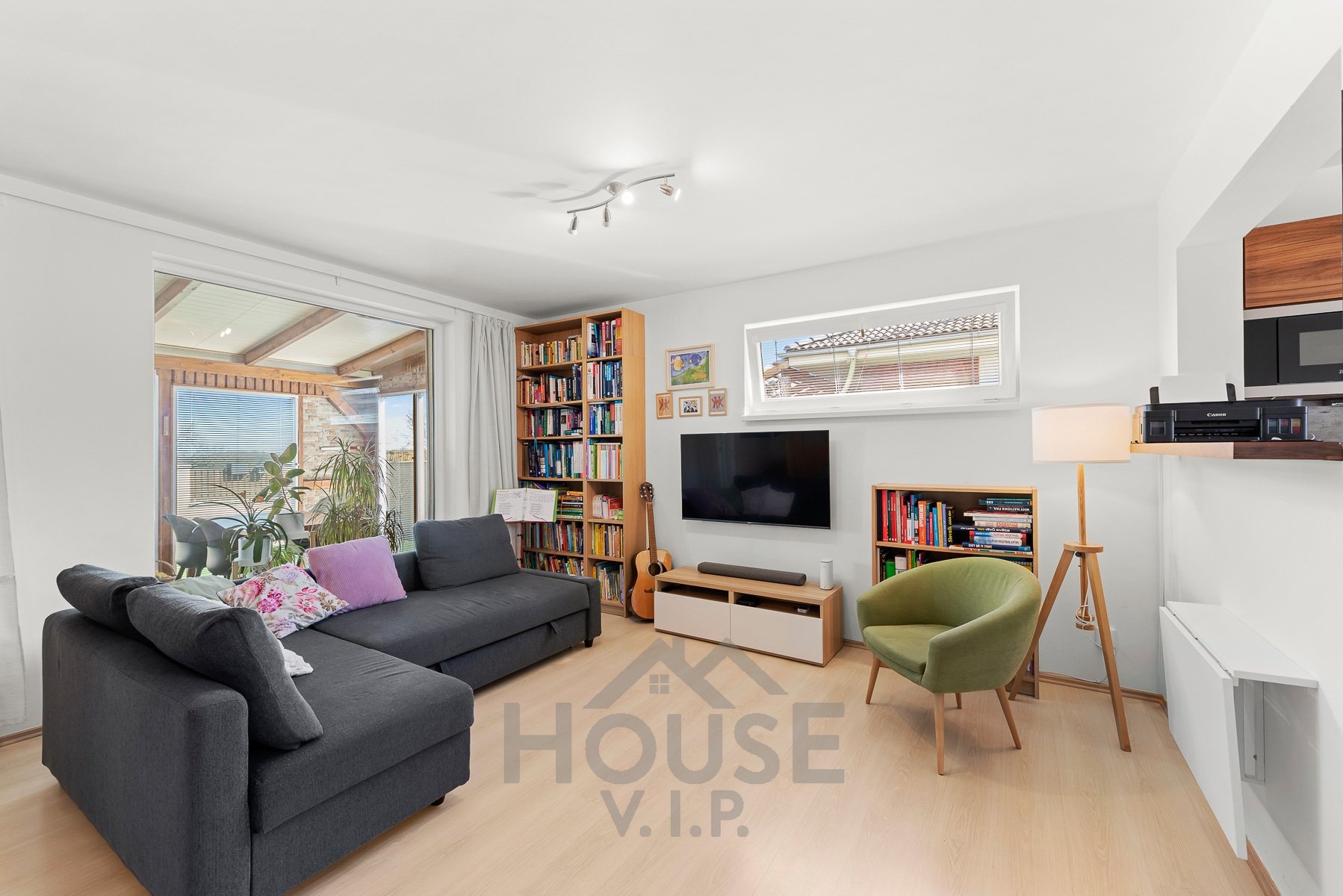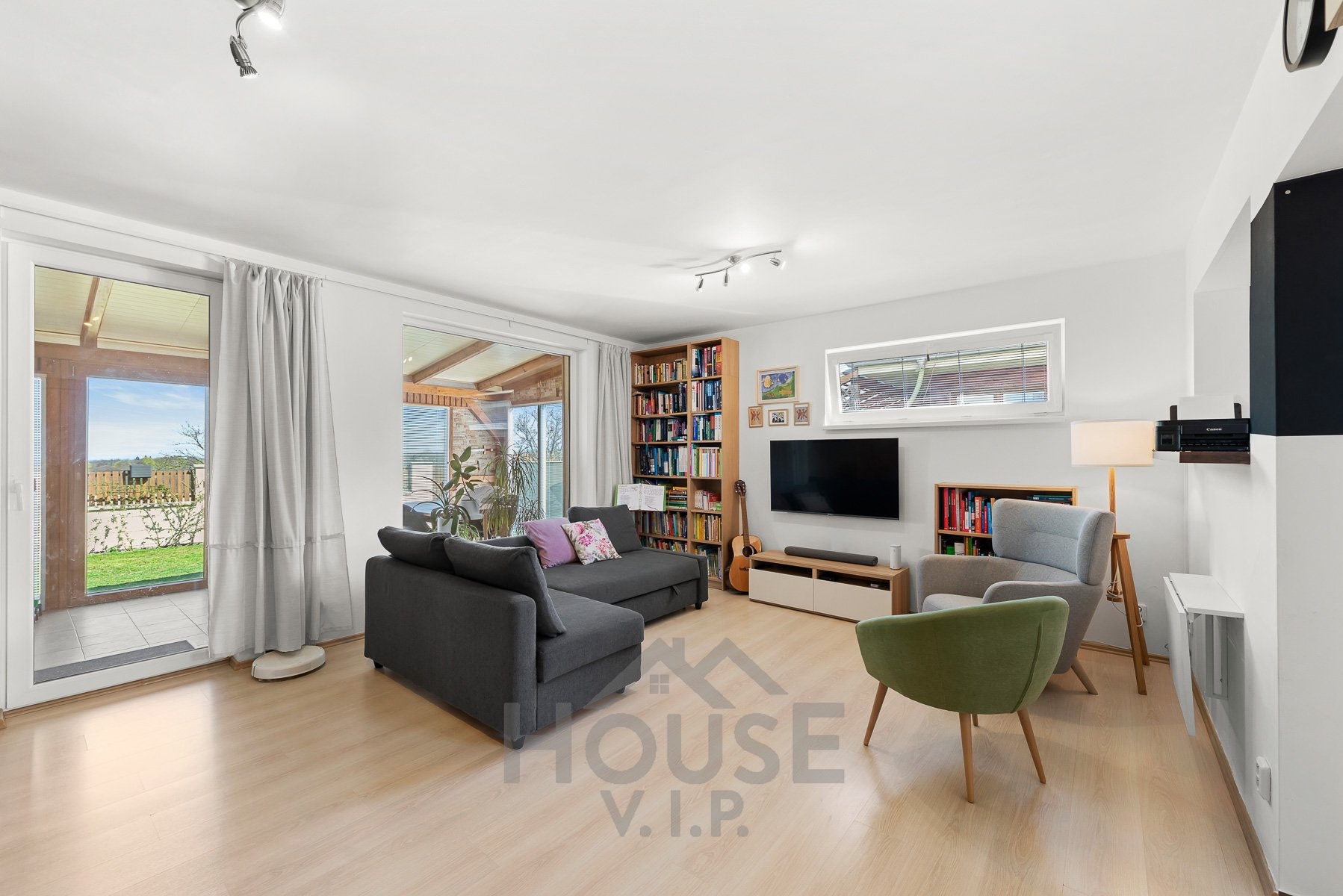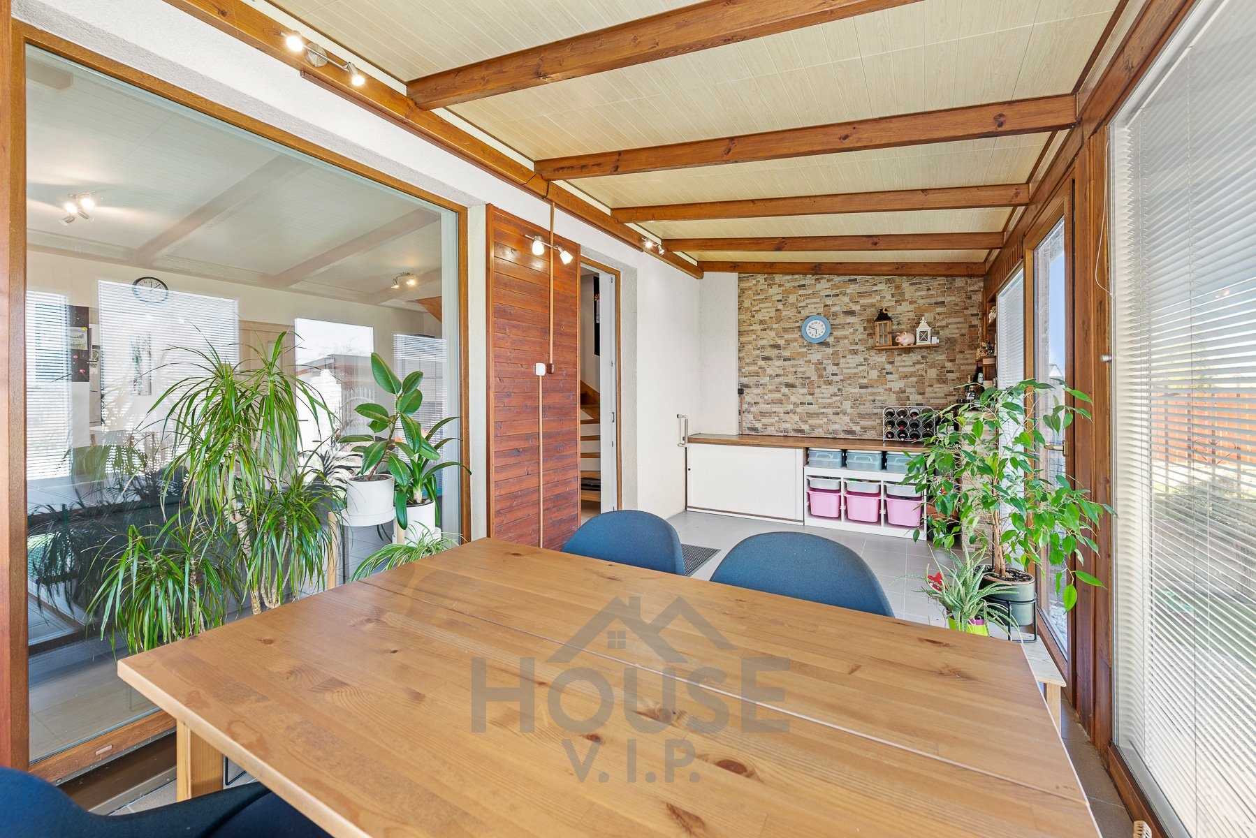 V přízemí se nachází obytná část s podlahovým vytápěním, které zajišťuje příjemné teplo a pohodlí během celého roku. Součástí domu je také zimní zahrada (17 m2) s přímým vstupem na zahradu, která poskytuje ideální místo pro relaxaci i posezení s rodinou či přáteli.