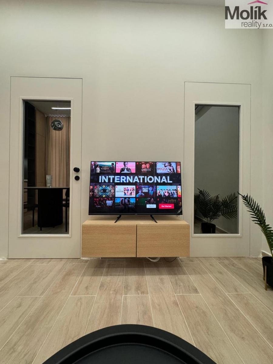 Vybavení: Designová TV stěna s mramorovým dekorem, stylový jídelní kout, ložnice s prémiovou šatní stěnou a integrovaným LED podsvícením.