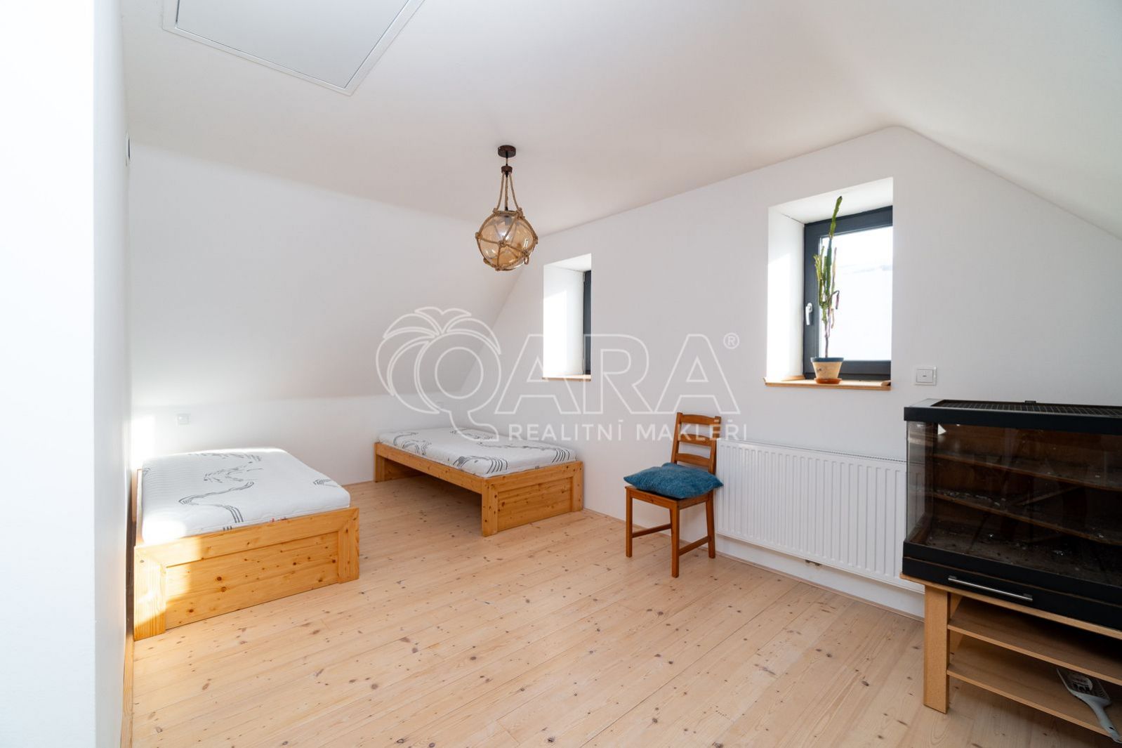 V patře se nachází další 4 pokoje, které mohou sloužit jako dětské pokoje, pracovna nebo například posilovna. Součástí domu je také místnost s lezeckou stěnou, sklep o velikosti cca 30 m a oddělená garáž, která je aktuálně využívána jako skladovací prostor s pračkou.