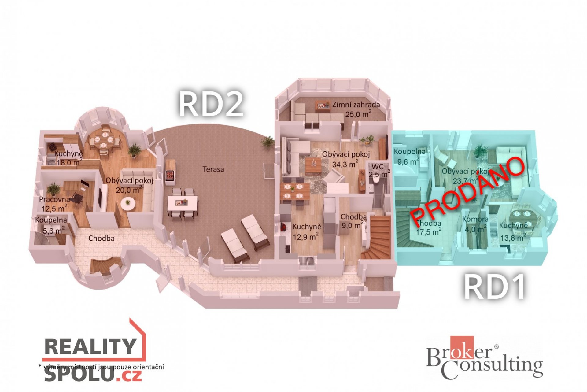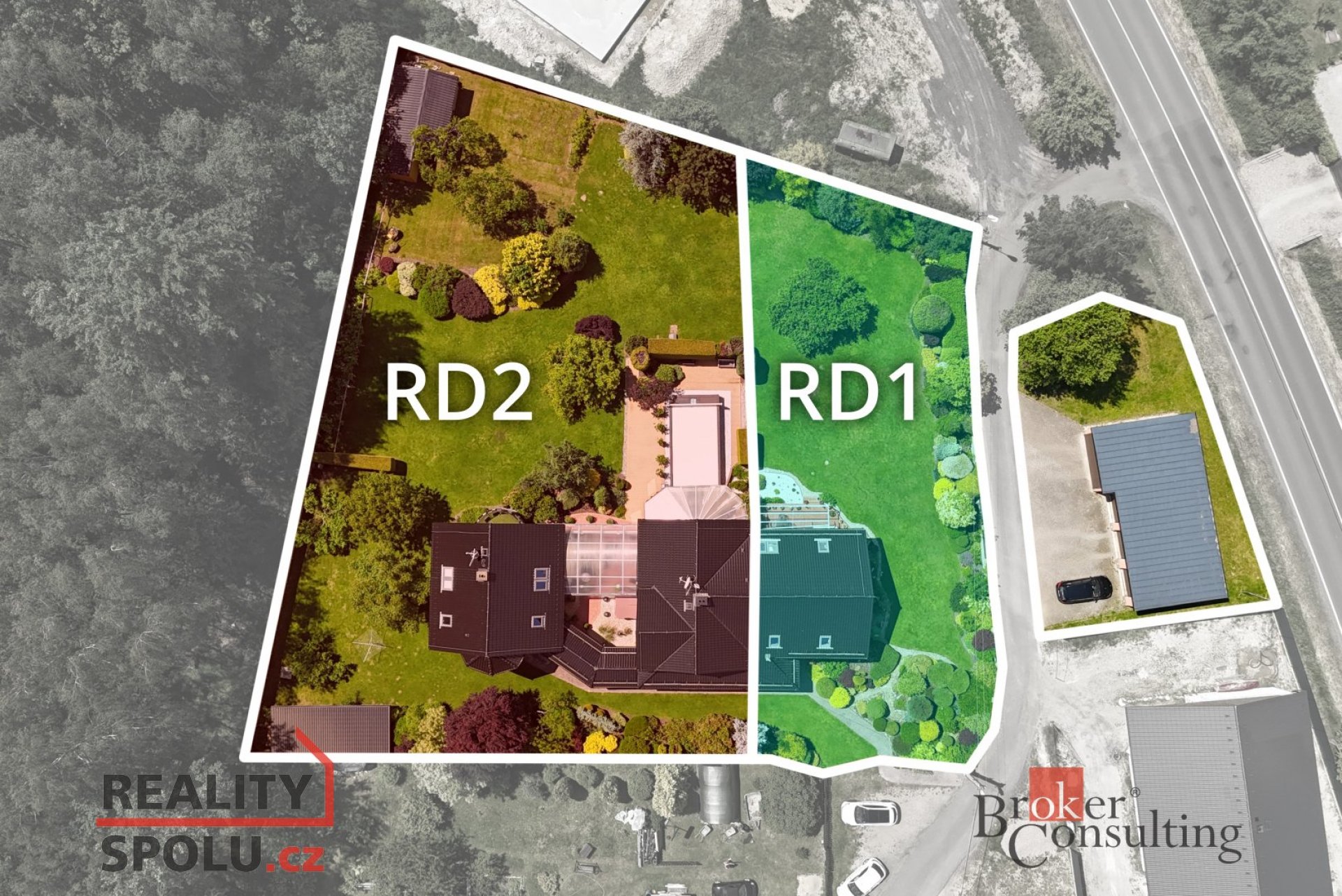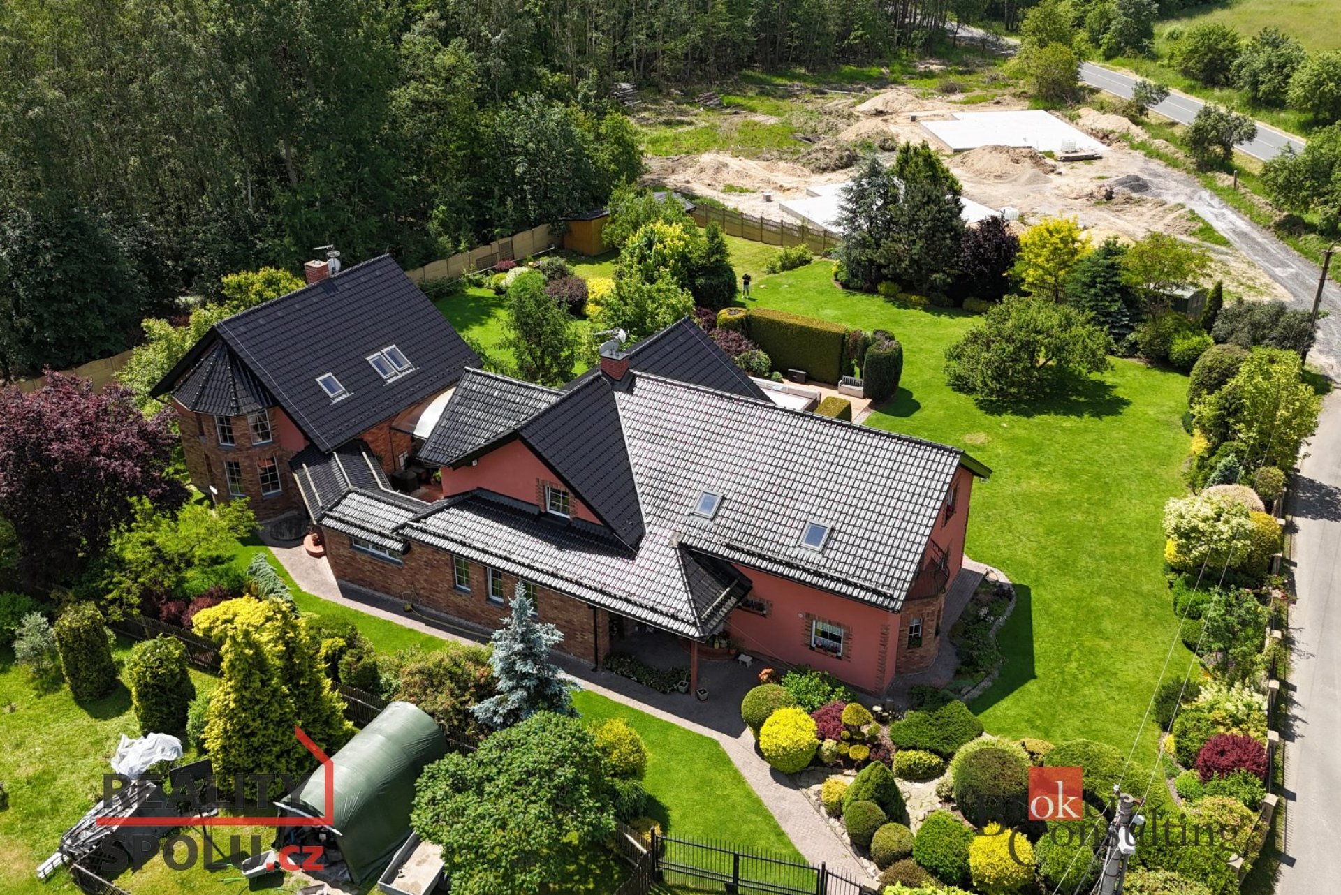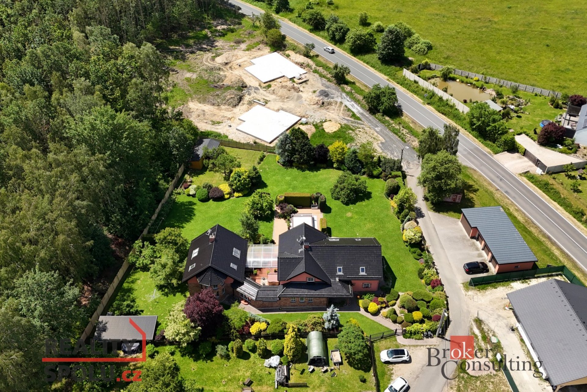 Krajová část domu:Navazující dům vystavený v roce 2010 je propojený vstupní chodbou s RD 2 disponuje vstupní halou, dále obývací pokoj s dřevěnou podlahou, vedlejší pokoj má přívod vody a odpadu na případné vybudování kuchyně. V této místností je i vedený komín pro případné napojení na krbová kamna. Koupelna se sprchou a toaletou. Spodní patro má podlahové vytápění. V patře je koupelna se sprchou a toaletou s podlahovým vytápěním. Další dva pokoje, který mají vstupy na společný balkón. Tento dům disponuje zastřešenou terasou se stahovacími žaluziemi. Zahrada je nádherně udržovaná se vzrostlými keři a dřevinami a má automatickou závlahu. Dvougenerační dům se nabízí za 8 mio. Kč.