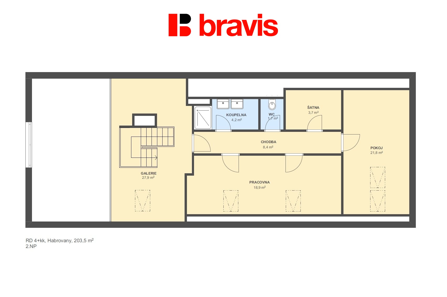 Po schodišti vystoupáte do galerie – jednoho z nejcharismatičtějších prvků celého domu. Tento vzdušný prostor dodává domu nezaměnitelný architektonický charakter. Galerie nabízí protor pro pracovní či studijní koutek nebo pro soukromou čítárnu.
