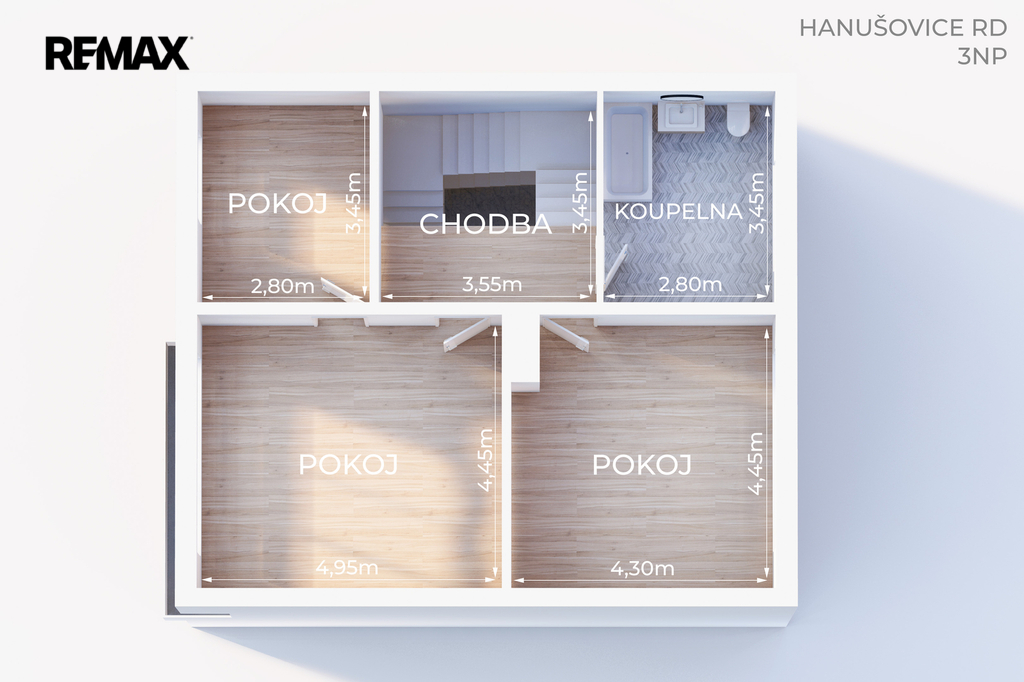 chodba, koupelna, komora, kuchyně, obývací pokoj se vstupem na balkon a ložnice