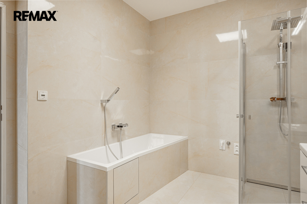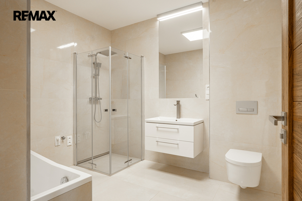 * kvalitní sanita (sprchový kout i vana) a přípojné místo pro pračku i sušičku