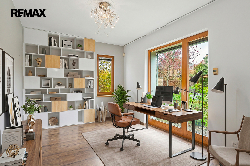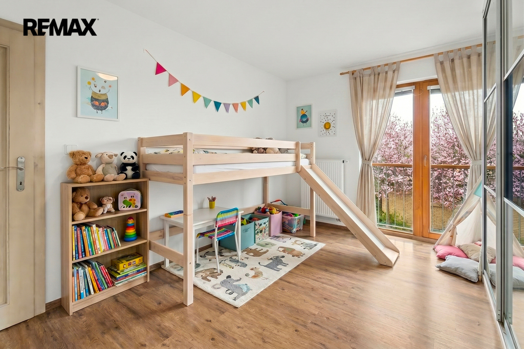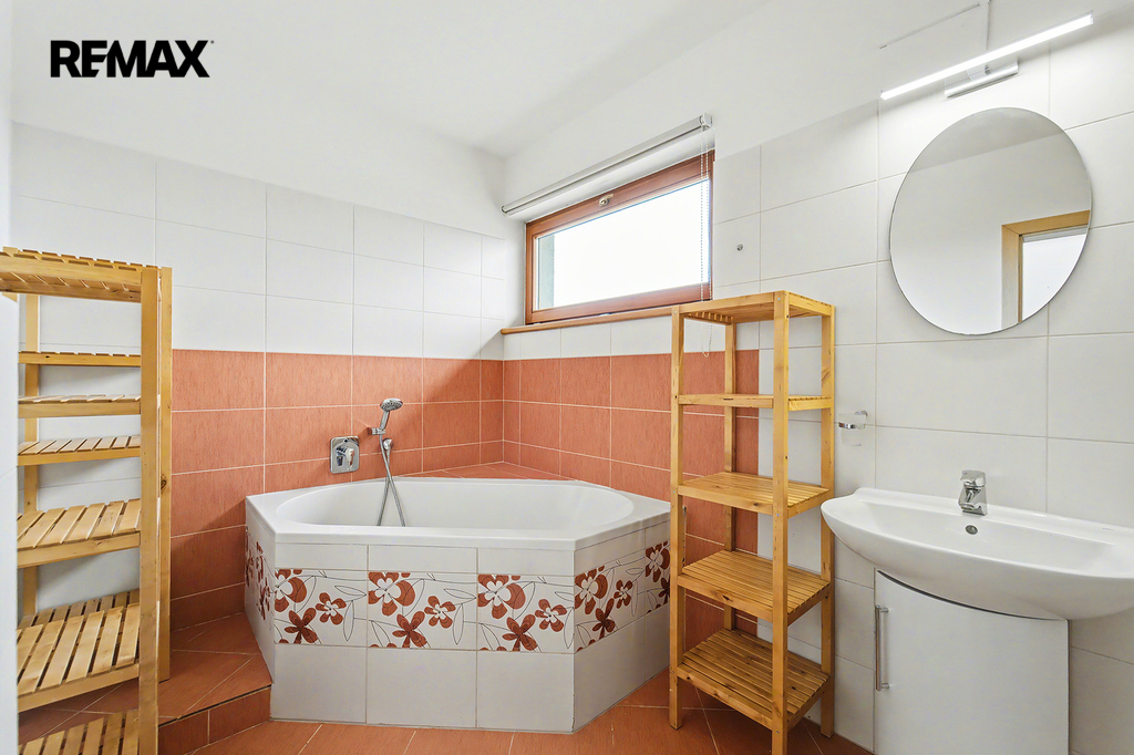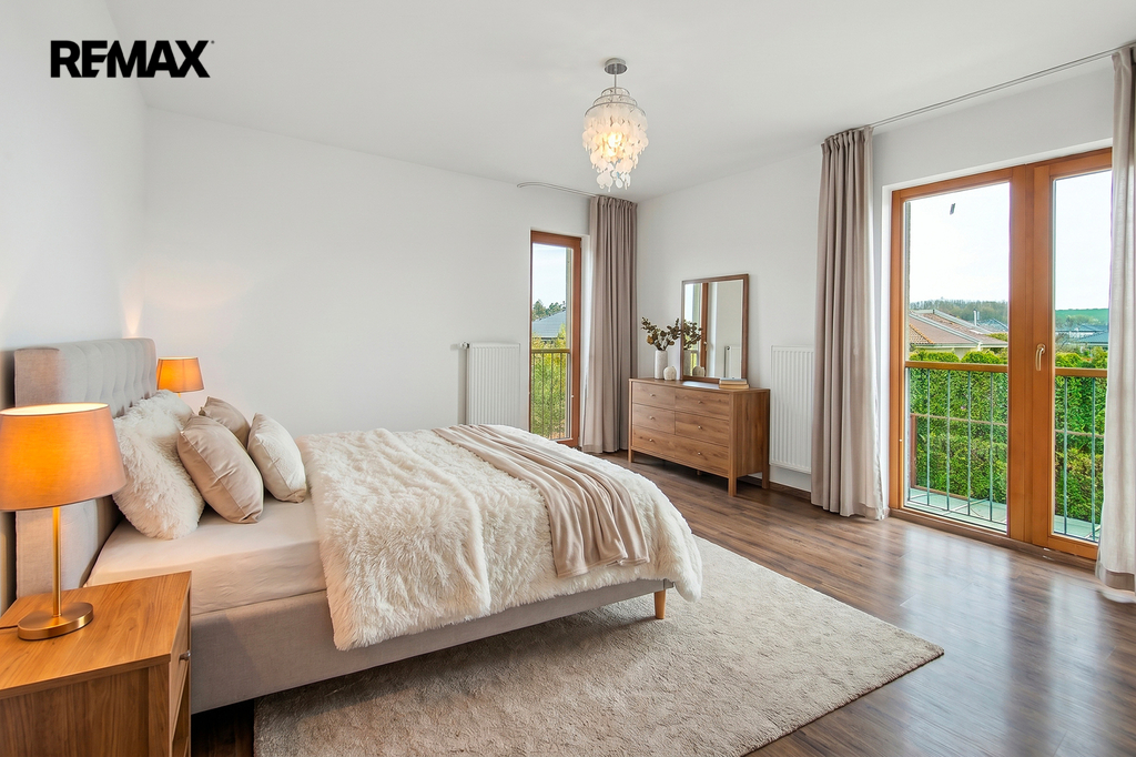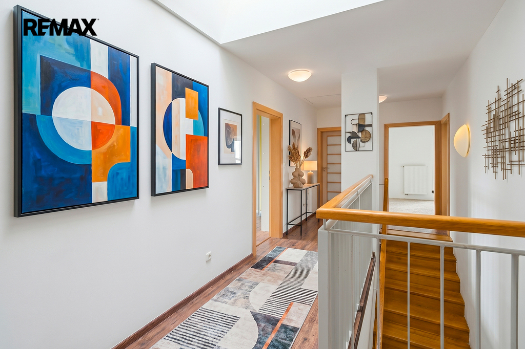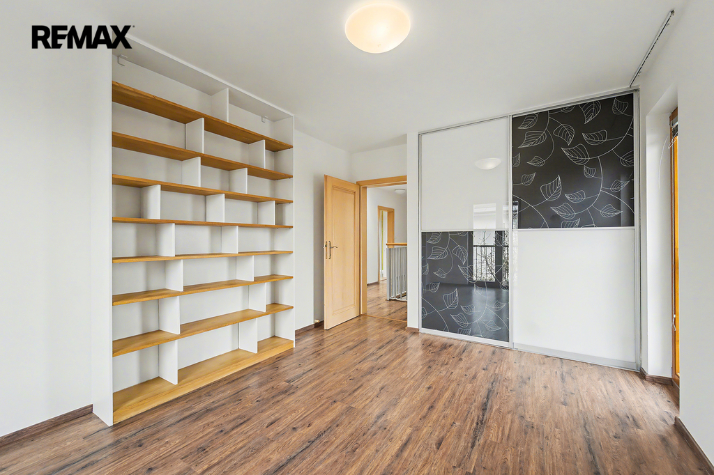 V patře se nachází pět samostatných ložnic, dvě koupelny a šatna. Prostor snadno přizpůsobíte vašim konkrétním potřebám.