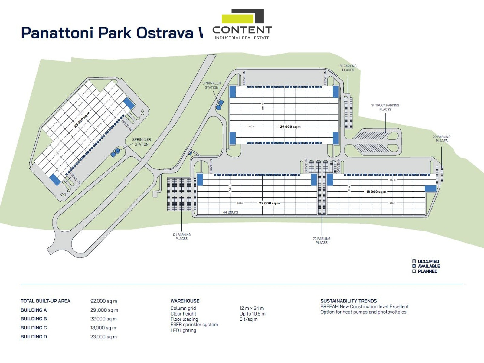 - samostatné prostory v budově C, až 19200 m², lze dělit od 5000 m²,
