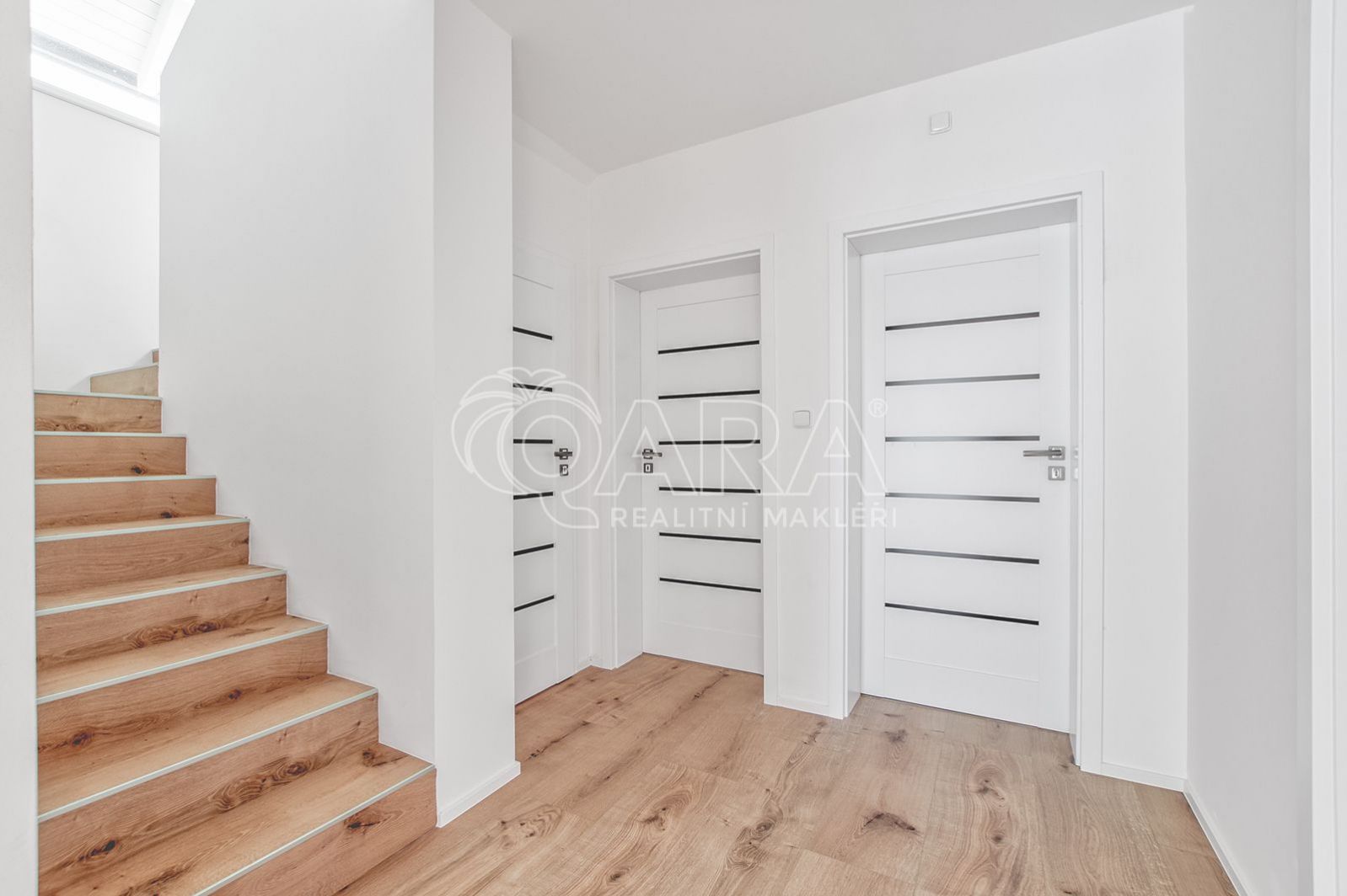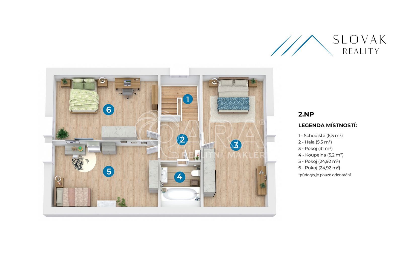 Druhé patro nabízí tři velké, světlé pokoje každý z nich s dostatkem prostoru pro dětský pokoj, pracovnu nebo další ložnici. Součástí patra je rovněž koupelna s vanou a nikami.
