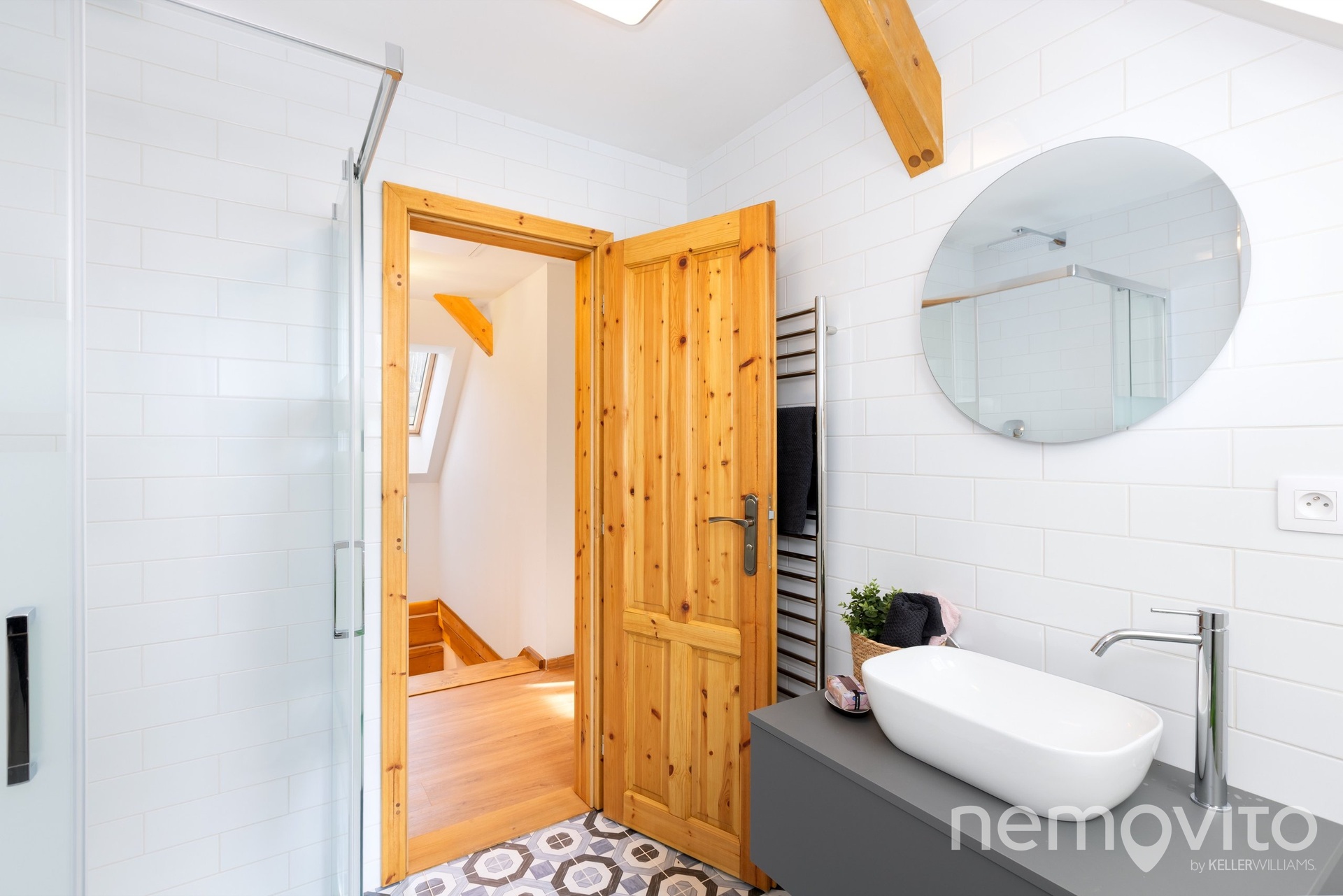 Dvoupodlažní dům s dispozicí 4+kk a dvěma koupelnami má nad celým půdorysem prostornou půdu a taky venkovní zahradní domek, který je stejně jako celá opěrná zeď obložen pískovcem. Všechny tři ložnice se nachází nahoře, dole je tak především společenská část domu s koupelnou, ve které je zakomponována sauna. Vytápění je dole řešeno podlahovkou, případně pak krásnými kachlovými kamny. V domě je dostatek světla díky soustavě velkých oken a kdo by snad zatoužil po zimní zahradě, zastřešený prostor nabízí velká terasa s přesahem střechy.