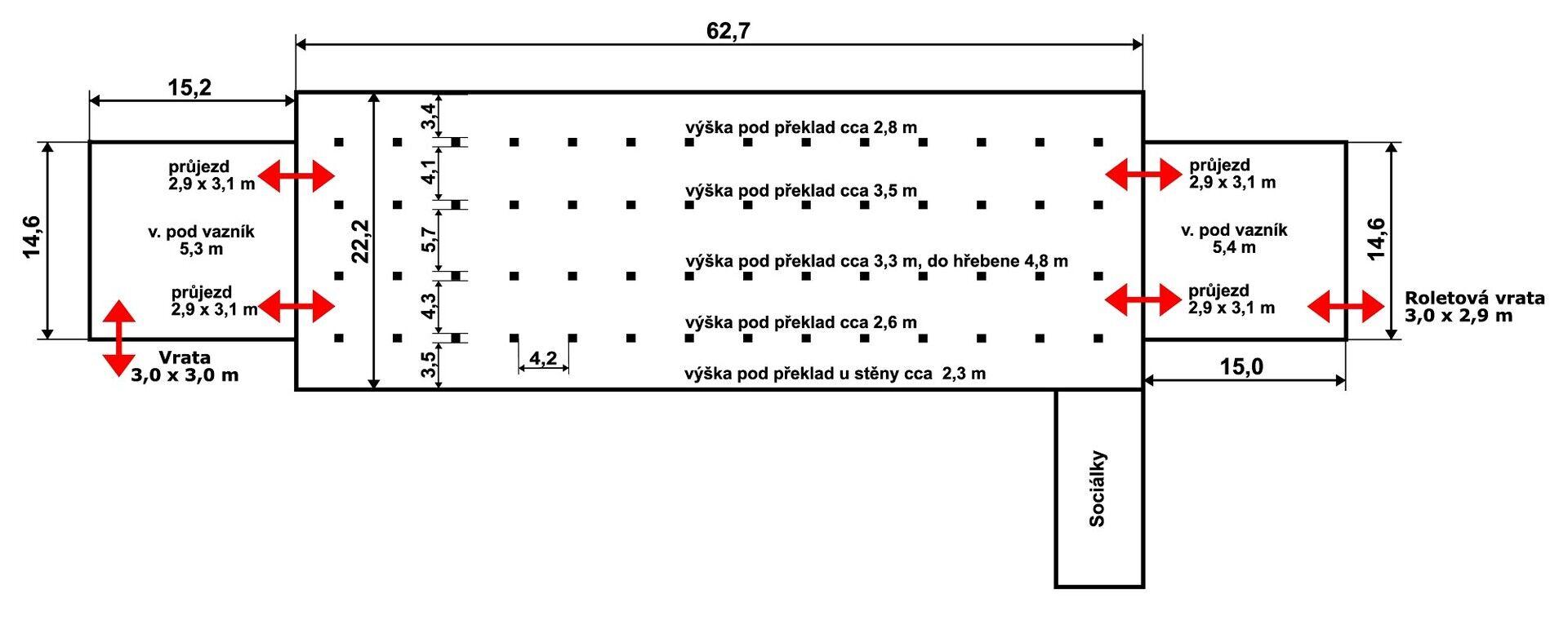 - mezi halami 1 a 3 a halou 2 jsou vždy dva průjezdy 2,9 × 3,1 m,