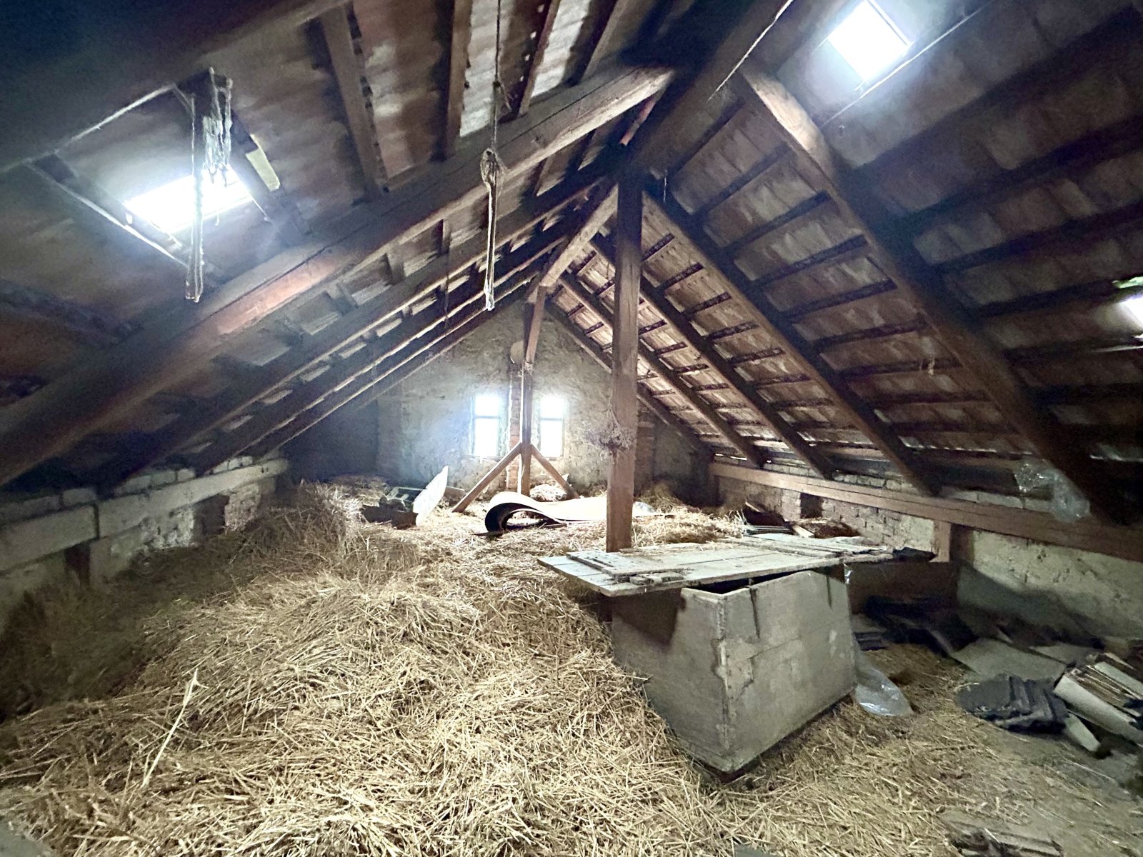 V podkroví: prostorná půda vhodná na půdní vestavbu 2-3 pokojů s koupelnou. Dobrý stav krovů.