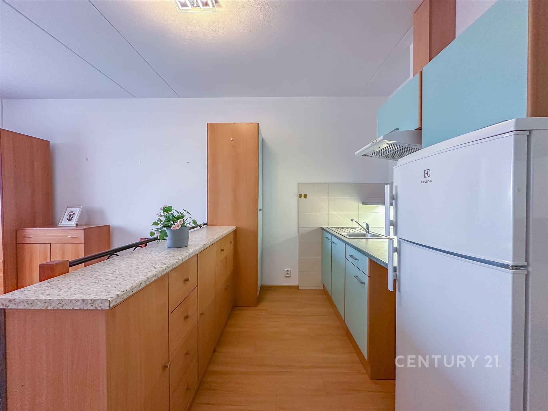 Kuchyňská část je vybavena digestoří a lednicí, přičemž nový nájemník si může zvolit způsob vaření podle sebe. Je možné využít přenosnou varnou desku, nebo se domluvit s majitelkou na úpravě kuchyňské linky a instalaci samostatně stojící trouby se sporákem.