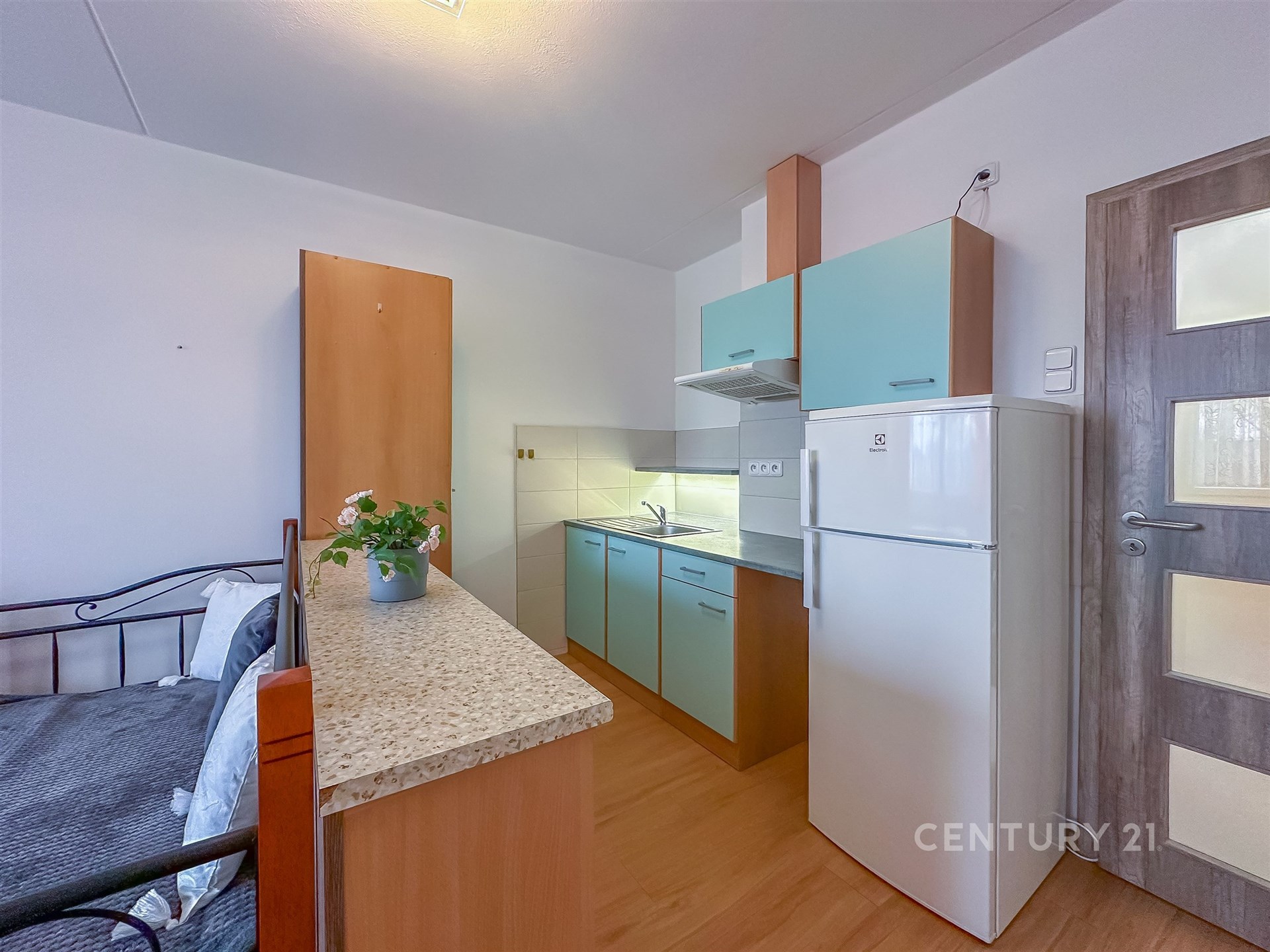 Obytný prostor působí čistým a vzdušným dojmem, je zde nová kovová postel bez matrace a podlahy jsou řešeny moderním vinylem, který dodává bytu příjemný vzhled i snadnou údržbu.