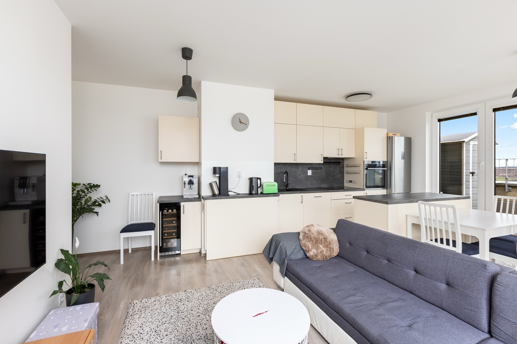 Prostorný obývací pokoj propojený s moderním kuchyňským koutem včetně vestavěných spotřebičů a jídelní částí zaručí dostatek prostoru pro celou rodinu.