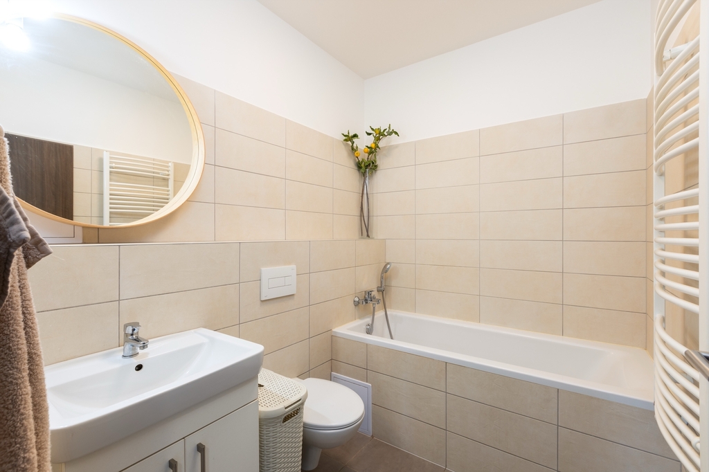 Výhodou bytu jsou dvě toalety, jedna součástí koupelny s vanou a druhá samostatná.