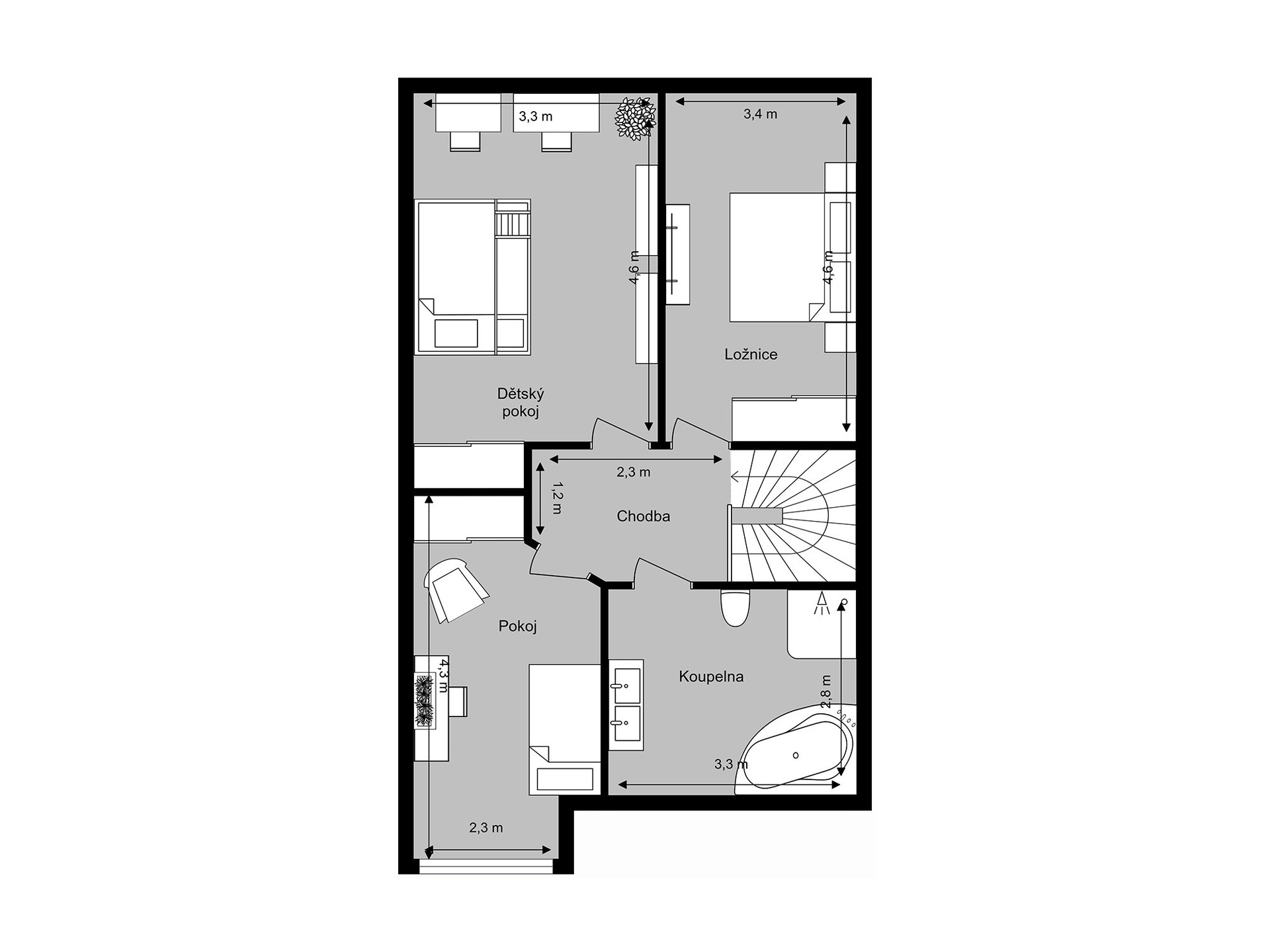 - 3 pokoje, koupelna, toaleta