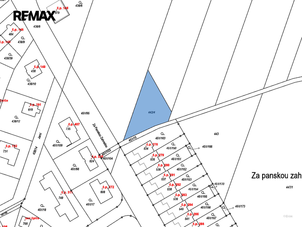 Pozemek má trojúhelníkový tvar, přičemž nejdelší strana měří 52 metrů. Leží v blízkosti zástavby řadových domů, což zajišťuje příjemné sousedství a zároveň dostatek prostoru pro soukromí. Inženýrské sítě jsou pod komunikací přímo u pozemku.