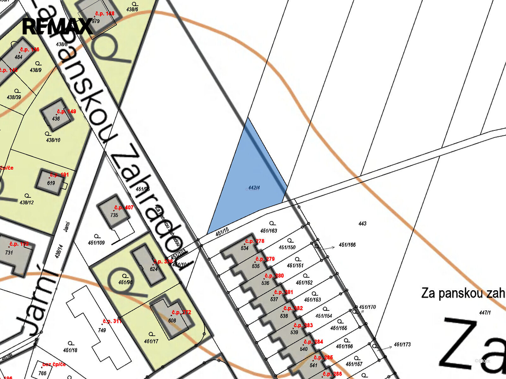 Pozemek má trojúhelníkový tvar, přičemž nejdelší strana měří 52 metrů. Leží v blízkosti zástavby řadových domů, což zajišťuje příjemné sousedství a zároveň dostatek prostoru pro soukromí. Inženýrské sítě jsou pod komunikací přímo u pozemku.