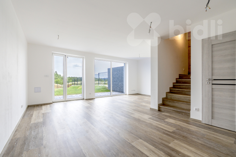Každý dům má dispozici 5+kk, která zahrnuje čtyři samostatné pokoje a prostorný obývací prostor propojený s kuchyní. Užitná plocha 126 m² poskytuje dostatek místa pro pohodlný rodinný život. Samostatné WC zajišťuje komfort pro každodenní provoz a francouzská okna vedoucí do zahrady přinášejí spoustu denního světla a propojují interiér s přírodou.