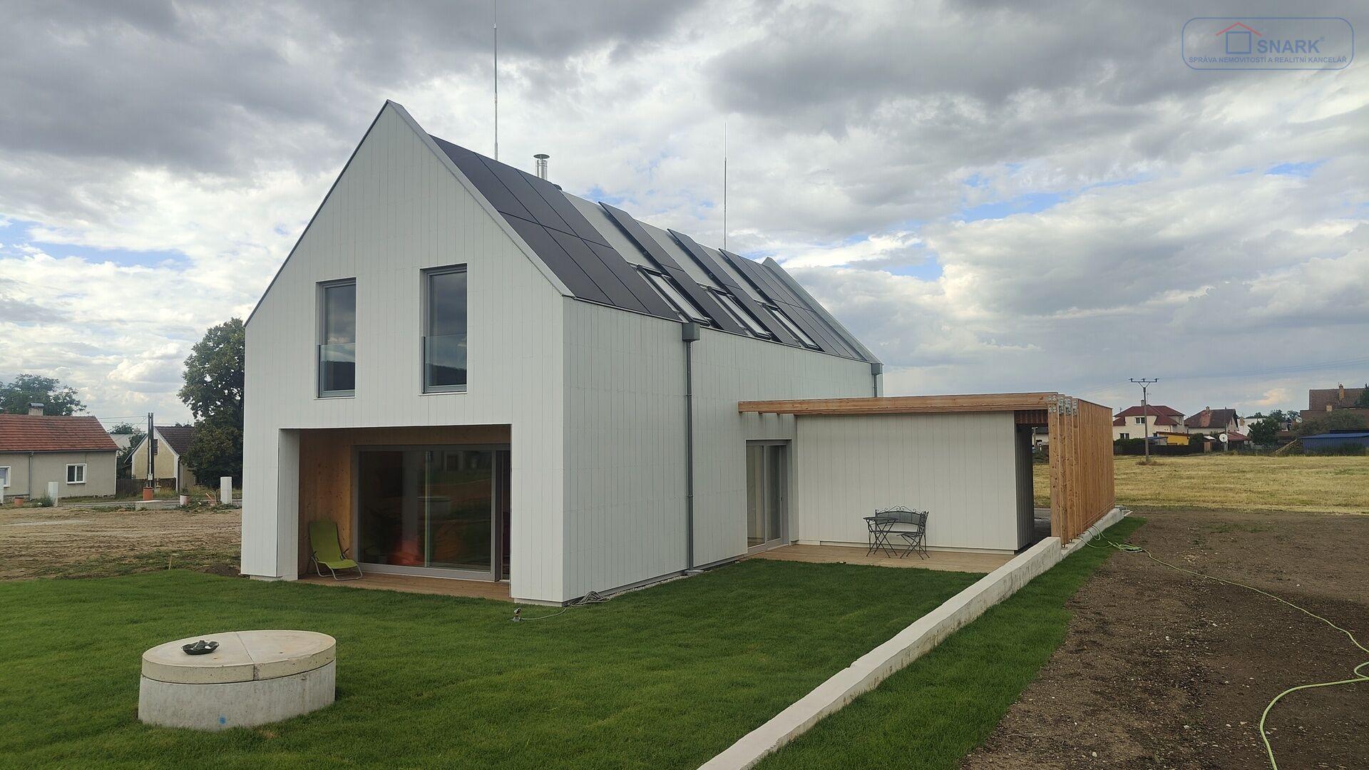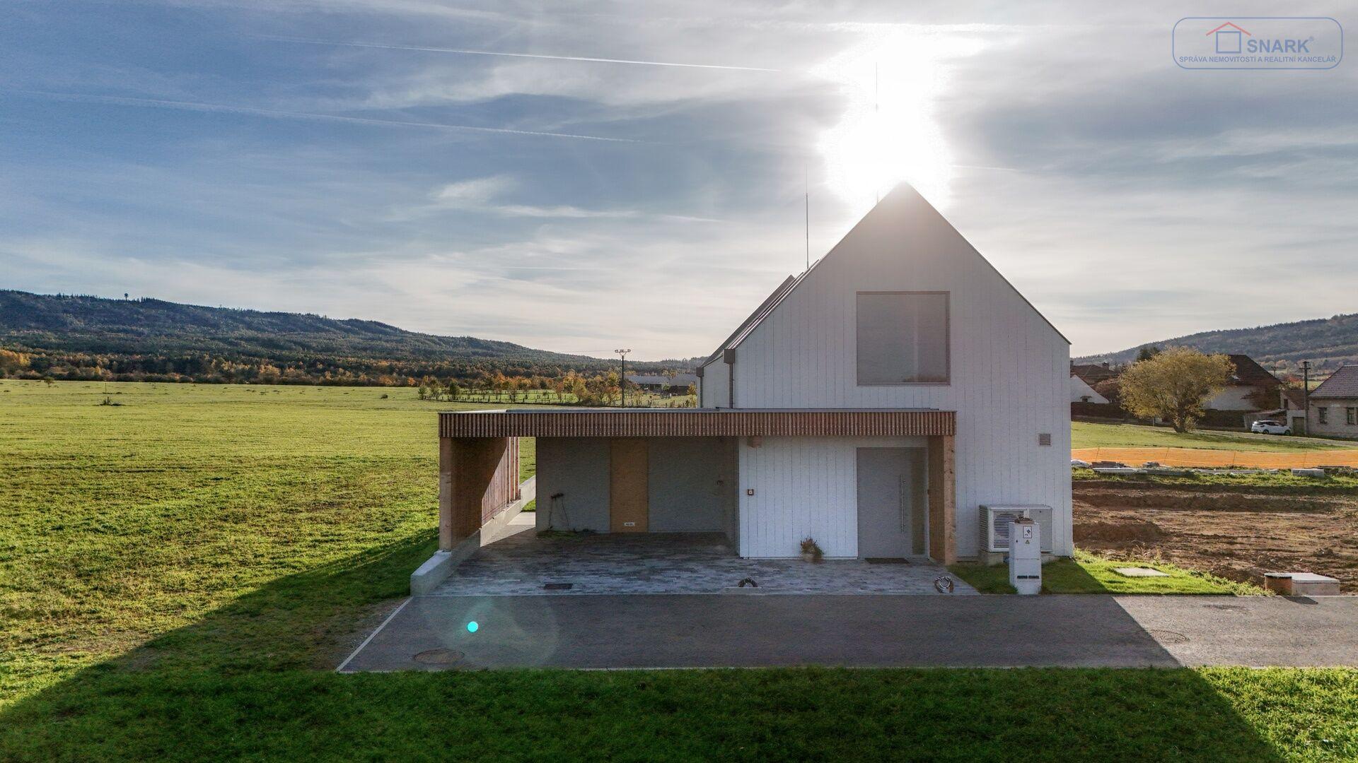 Díky velkým proskleným plochám a posuvným portálům se dům přirozeně otevírá do zahrady, která plynule přechází do okolní přírody. Dvě prostorné terasy nabízejí ideální prostor pro relaxaci, grilování nebo ranní kávu s výhledem do zeleně. Součástí pozemku je i krytý přístřešek pro dvě auta s přípravou na nabíječku pro elektromobil s integrovanou kolnou na zahradní nářadí.
