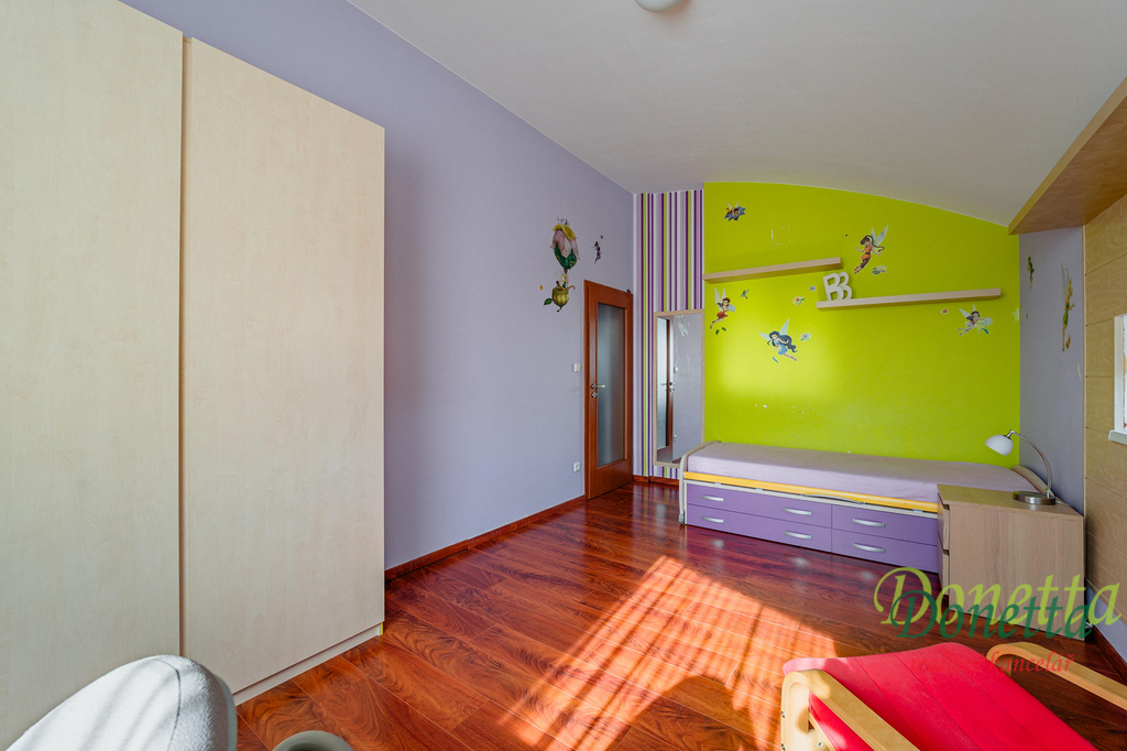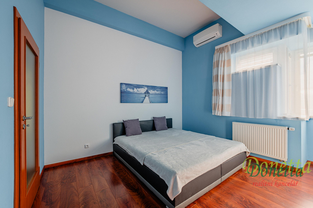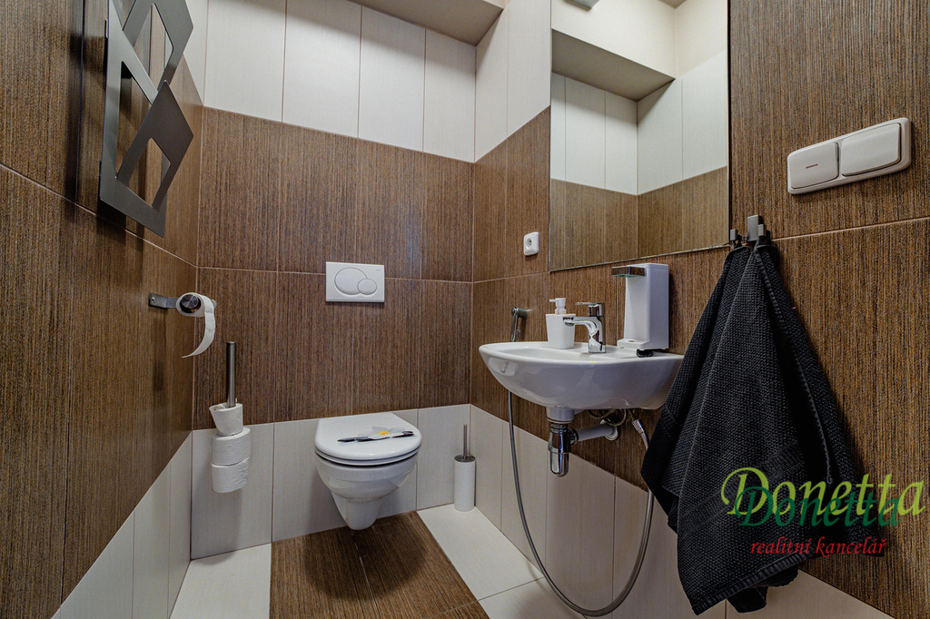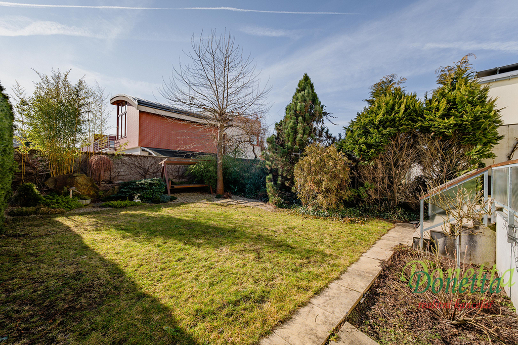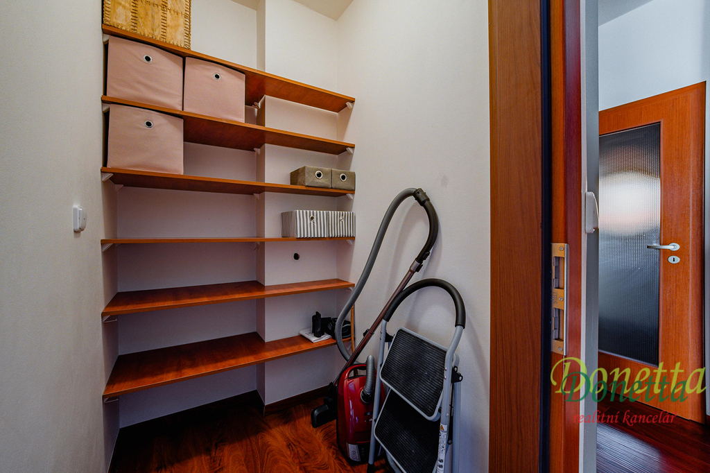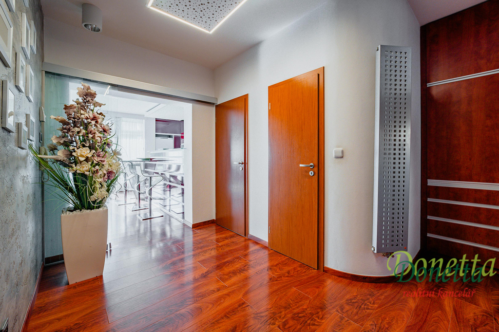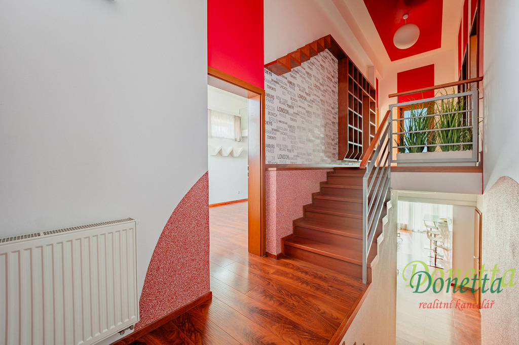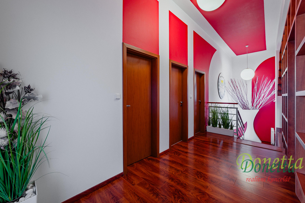 V patře se nachází chodba, prostorná koupelna, samostatné WC, šatna a 3 pokoje. V ložnici a v dětském pokoji je k dispozici klimatizace.