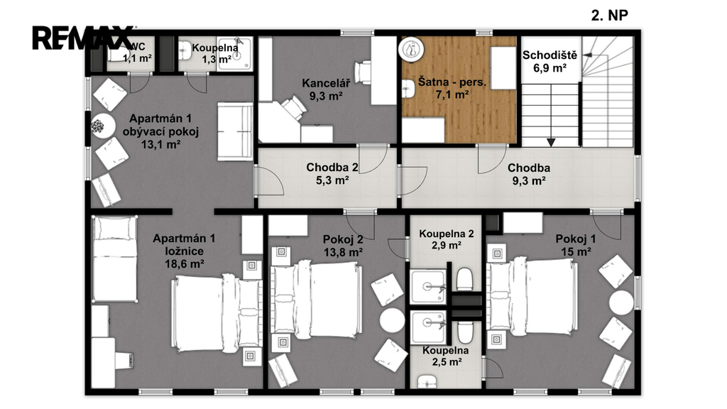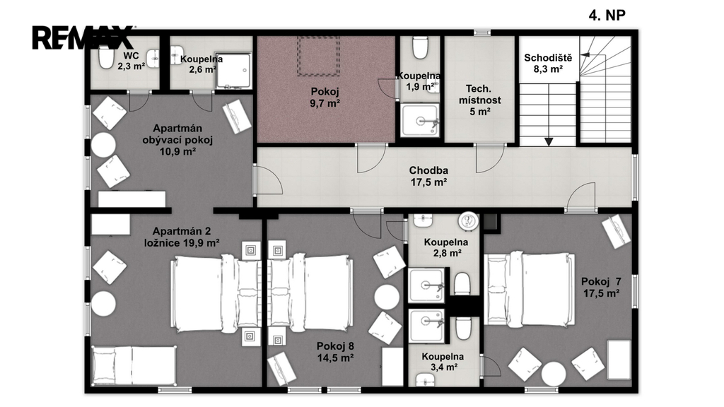 - Celkem 11 ubytovacích jednotek (vč. 2 apartmánů)