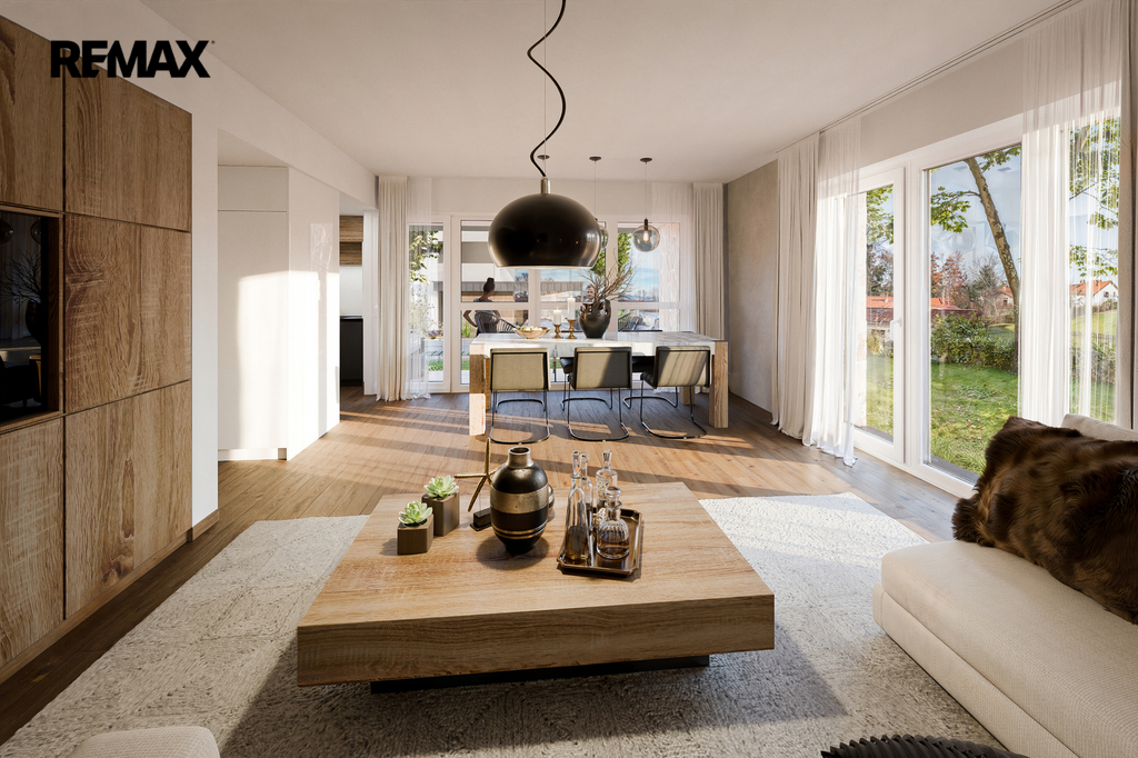 Interiér je možné dokončit na klíč podle výběru klienta. Developer nabízí širokou škálu kvalitních podlahových krytin, velkoformátové dlažby i moderní interiérové dveře. Elegantní dubové schodiště propojuje obě patra. V ceně je zahrnuta i moderní kuchyňský linka bez spotřebičů i kompletně vybavená koupelna s designovým podsvíceným zrcadlem.