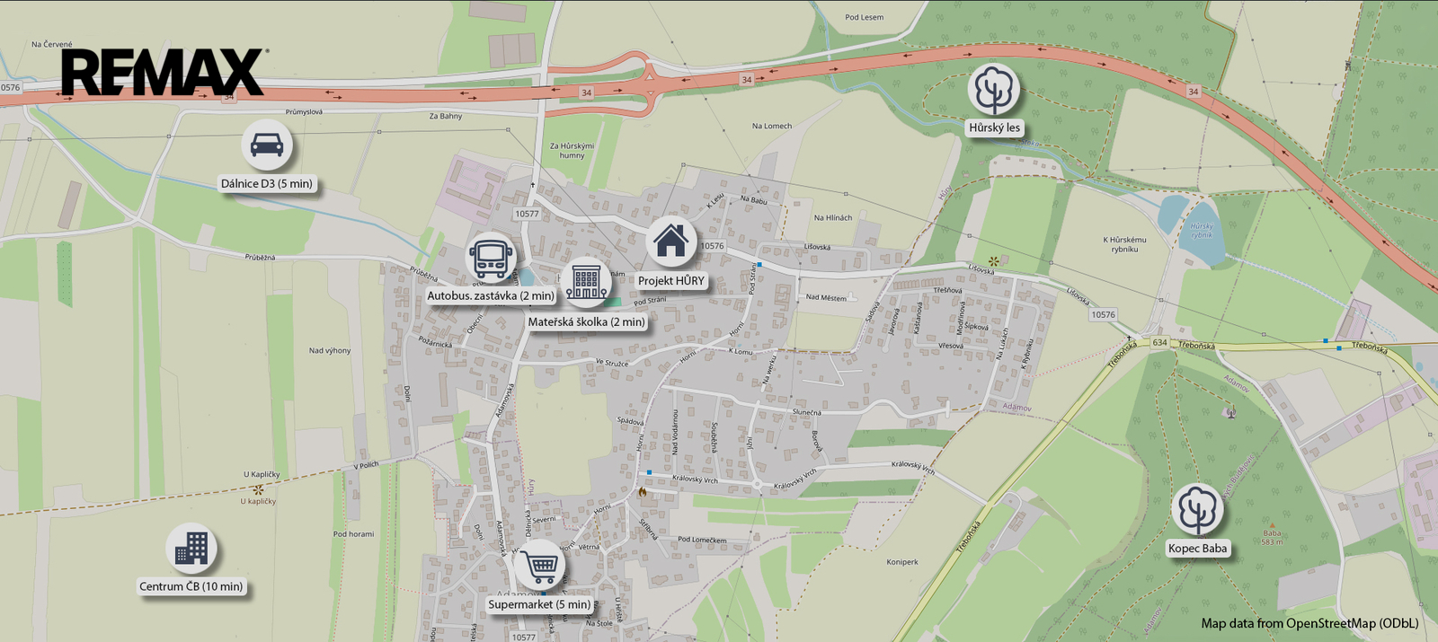 Lokalita Hůry nabízí ideální kombinaci klidného rodinného bydlení a skvělé dostupnosti. Do centra Českých Budějovic je to přibližně 6 km, dálnice D3 je vzdálena pouhých 5 minut jízdy a v blízkosti se nachází hlavní tah na Třeboň. V obci je mateřská školka i autobusové spojení pro školáky, což z ní činí živé a přátelské místo vhodné pro rodiny.