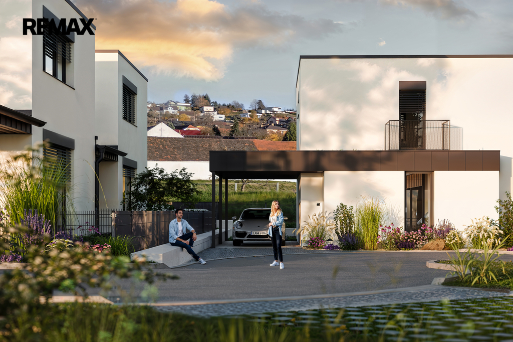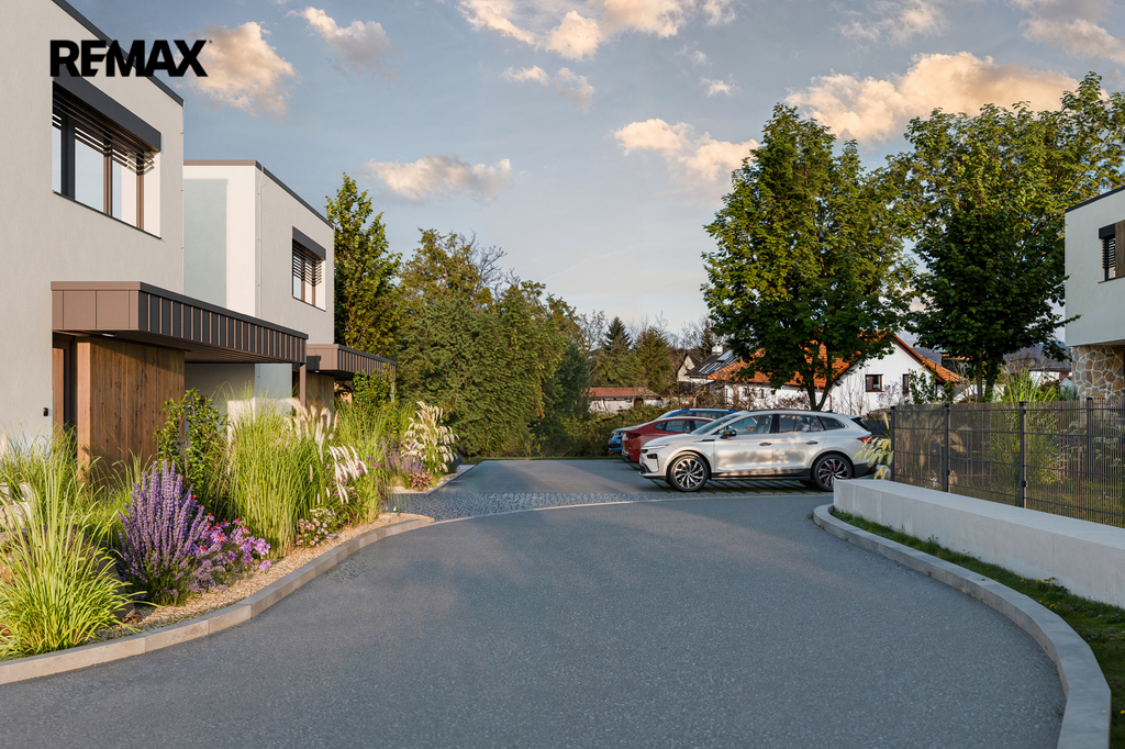 Součástí ceny je dokončený exteriér. Pozemek je oplocen svařovaným antracitovým plotem. Přední část pozemku je upravena zelení a doplněna o venkovní osvětlení se soumrakovým čidlem. Kryté parkovací stání je připraveno pro instalaci nabíjecího zařízení pro elektromobil.