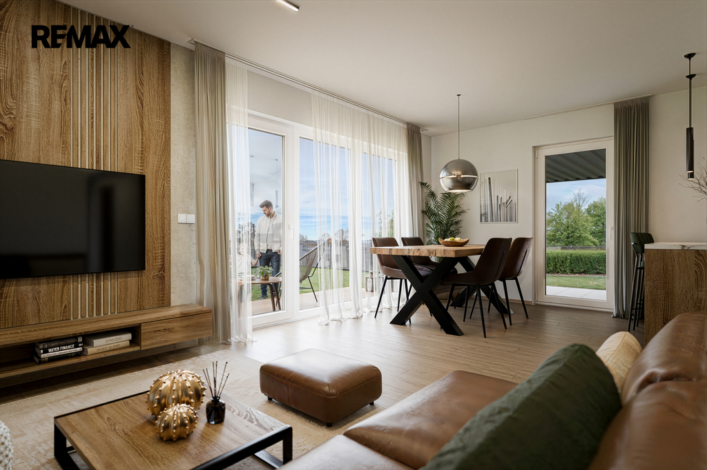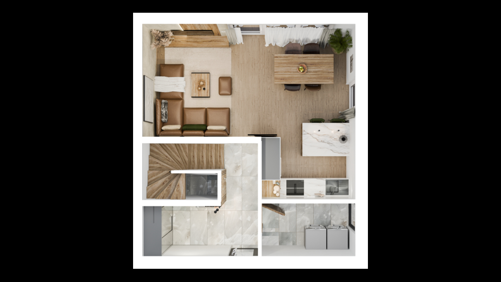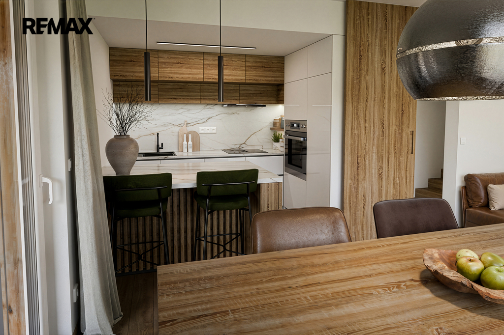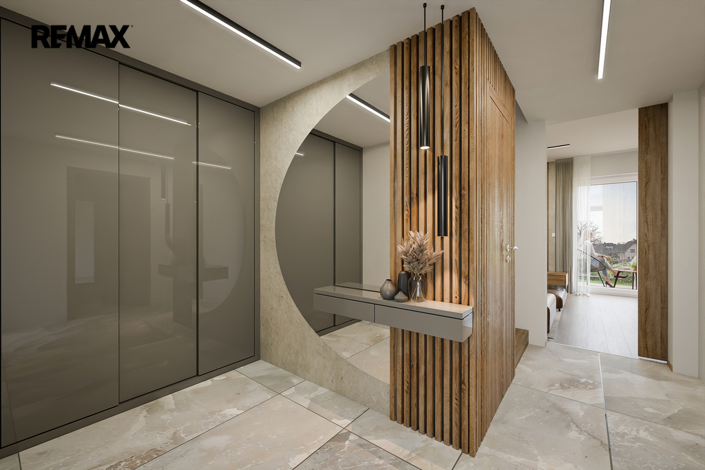 Dokončení interiéru probíhá dle výběru klienta v rámci standardů developera, které zahrnují podlahové krytiny, velkoformátové dlažby, interiérové dveře a dubové schodiště. V ceně je zahrnuta i moderní kuchyňský linka bez spotřebičů i kompletně vybavená koupelna s designovým podsvíceným zrcadlem.