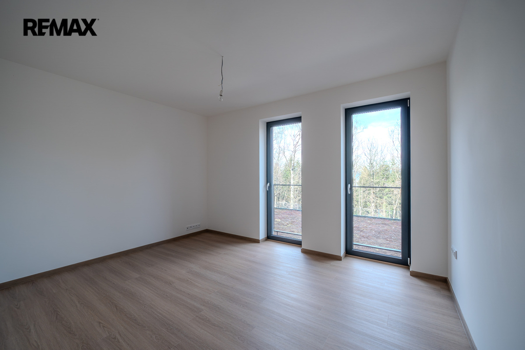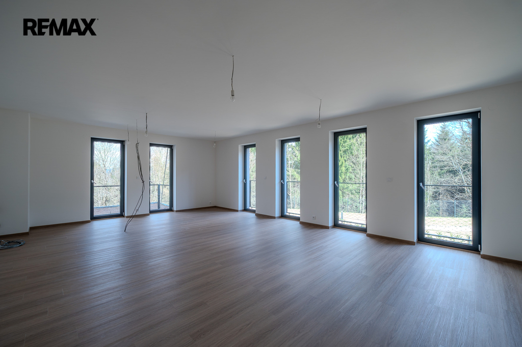 Dominantou bytu je obývací prostor s kuchyňským koutem a přímým vstupem na balkon, odkud si můžete vychutnat krásný výhled do okolní přírody. Luxusní provedení interiéru zahrnuje kvalitní materiály, podlahové vytápění pro maximální komfort a velkoformátová okna, která zajišťují dostatek denního světla.