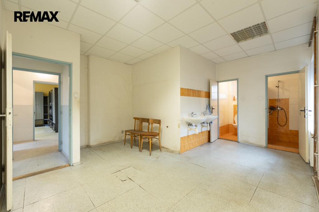 V přízemí se nachází administrativní část s kancelářemi, sociálním zázemím, sprchami a toaletami, dále kotelna a navazující otevřené prostory vhodné pro výrobu, skladování či jiné podnikatelské využití. Do této části je přístup také vraty a nakládací rampou ze zadní strany objektu.