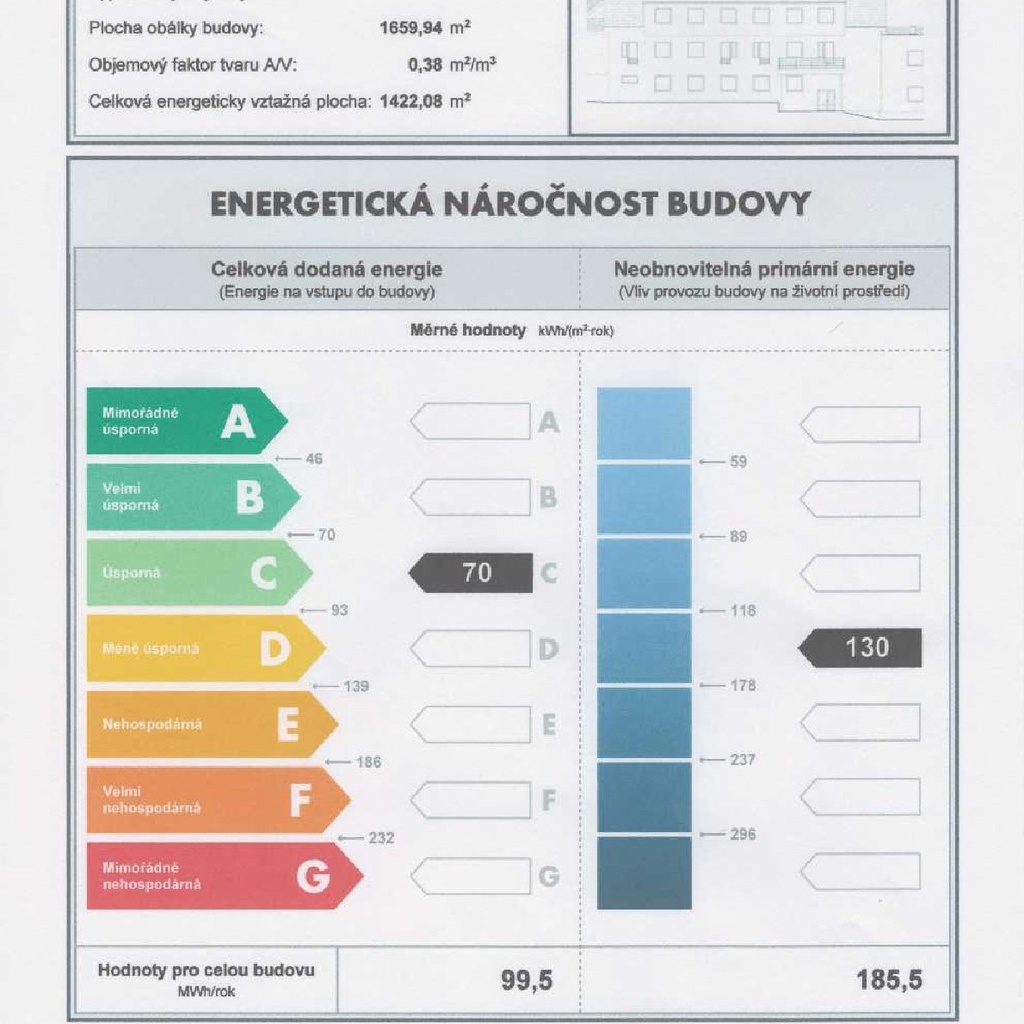 - Ukazatel energetické náročnosti budovy: 70 kWh/m²