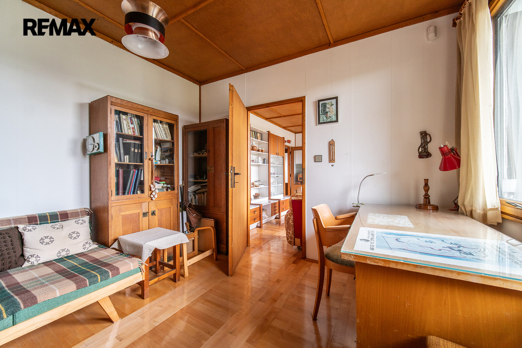 Přízemí: prostorná obytná hala s francouzskými okny a vstupem na terasu a zahradu, pokoj pro hosty či samostatné bydlení, koupelna, toaleta, komora.